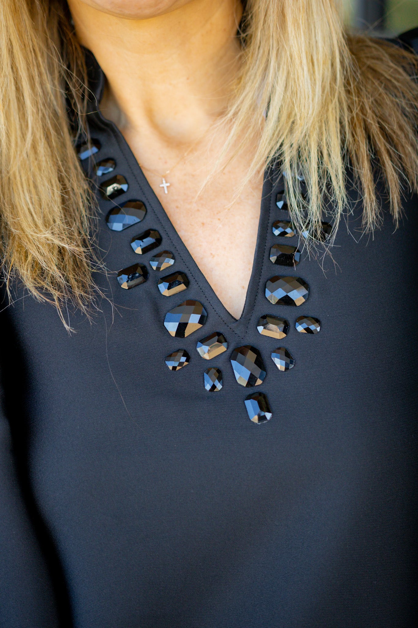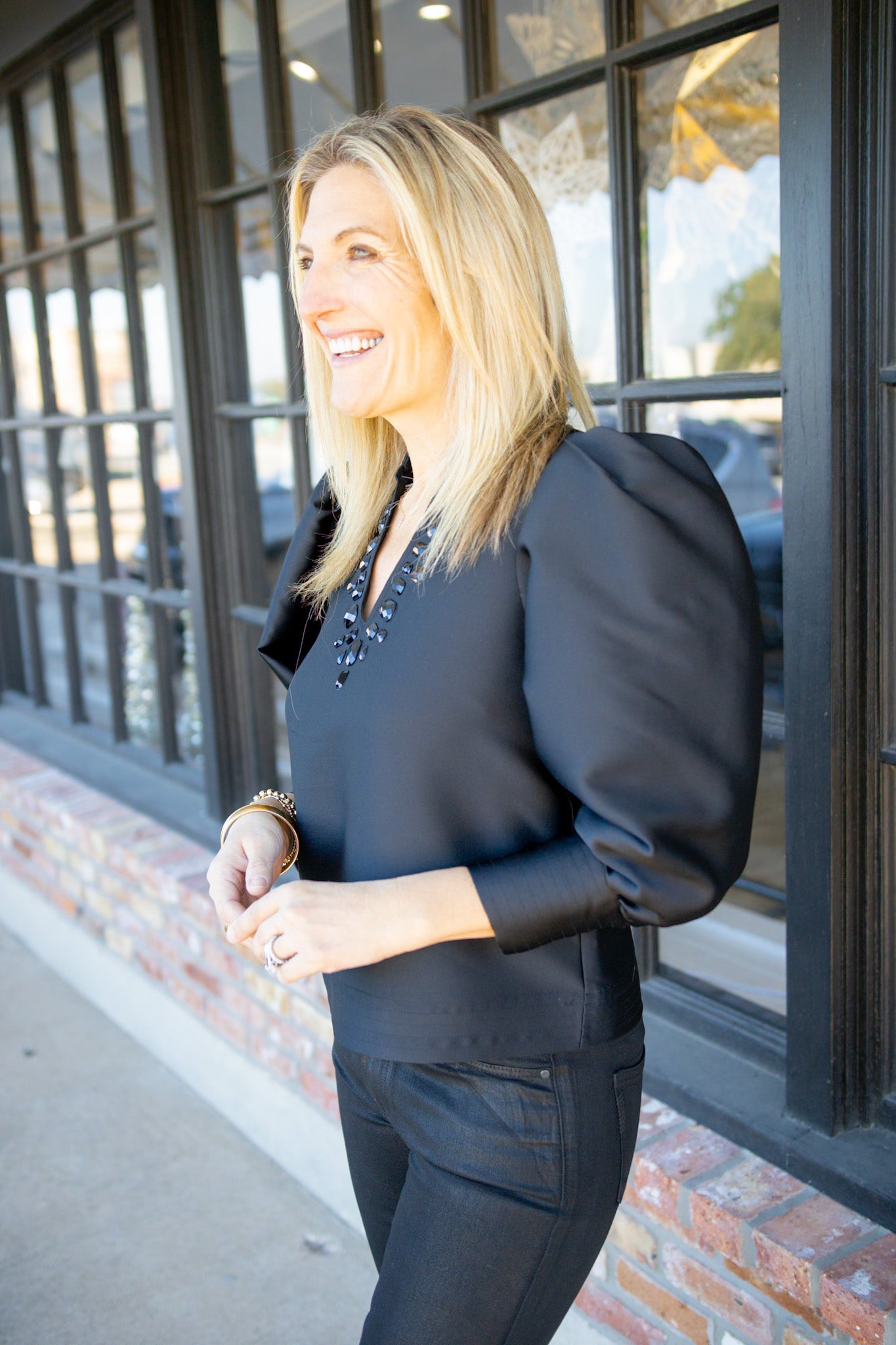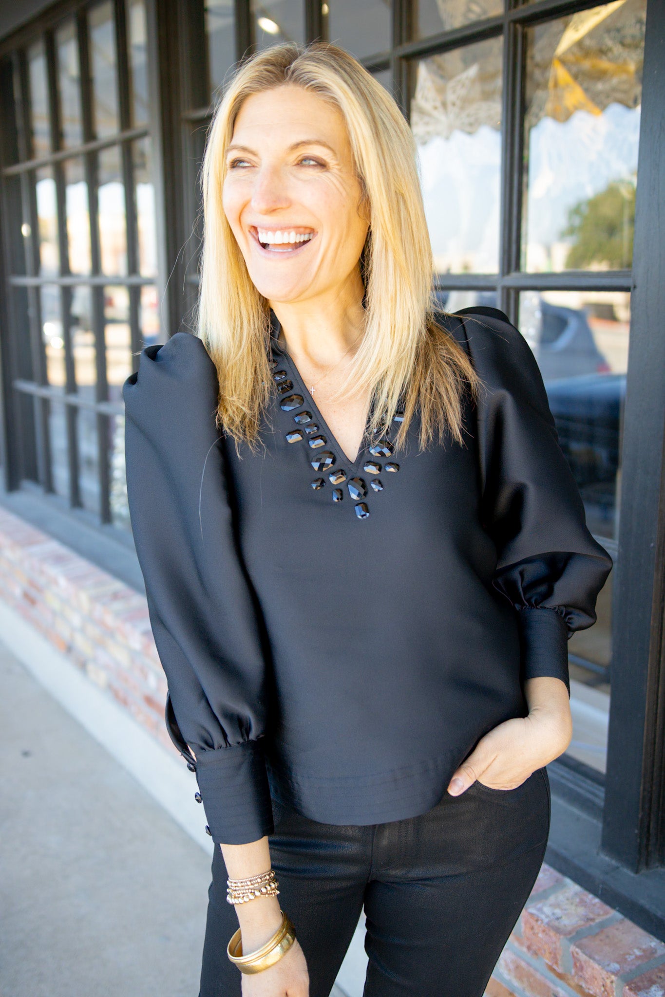 The Hampton Top in Midnight is structured perfection, designed with a lustrous finish and a hand-stoned neckline for an elevated touch. A mandarin-style collar frames the neckline, while puff sleeves with tapered cuffs add volume and balance. Its boxy yet tailored silhouette creates a refined shape that feels both modern and timeless. Style it with the matching Audrey Skirt for a tasteful statement look that’s perfect for elevated occasions this season.