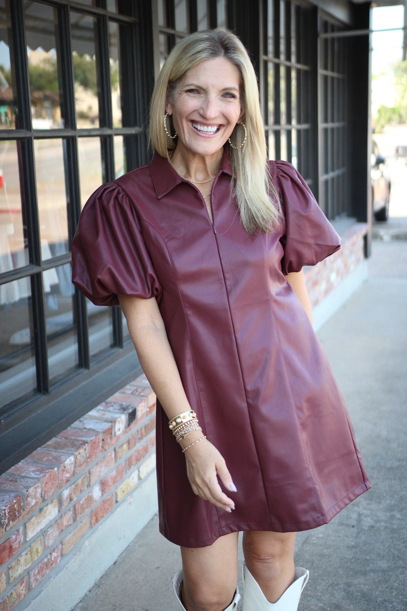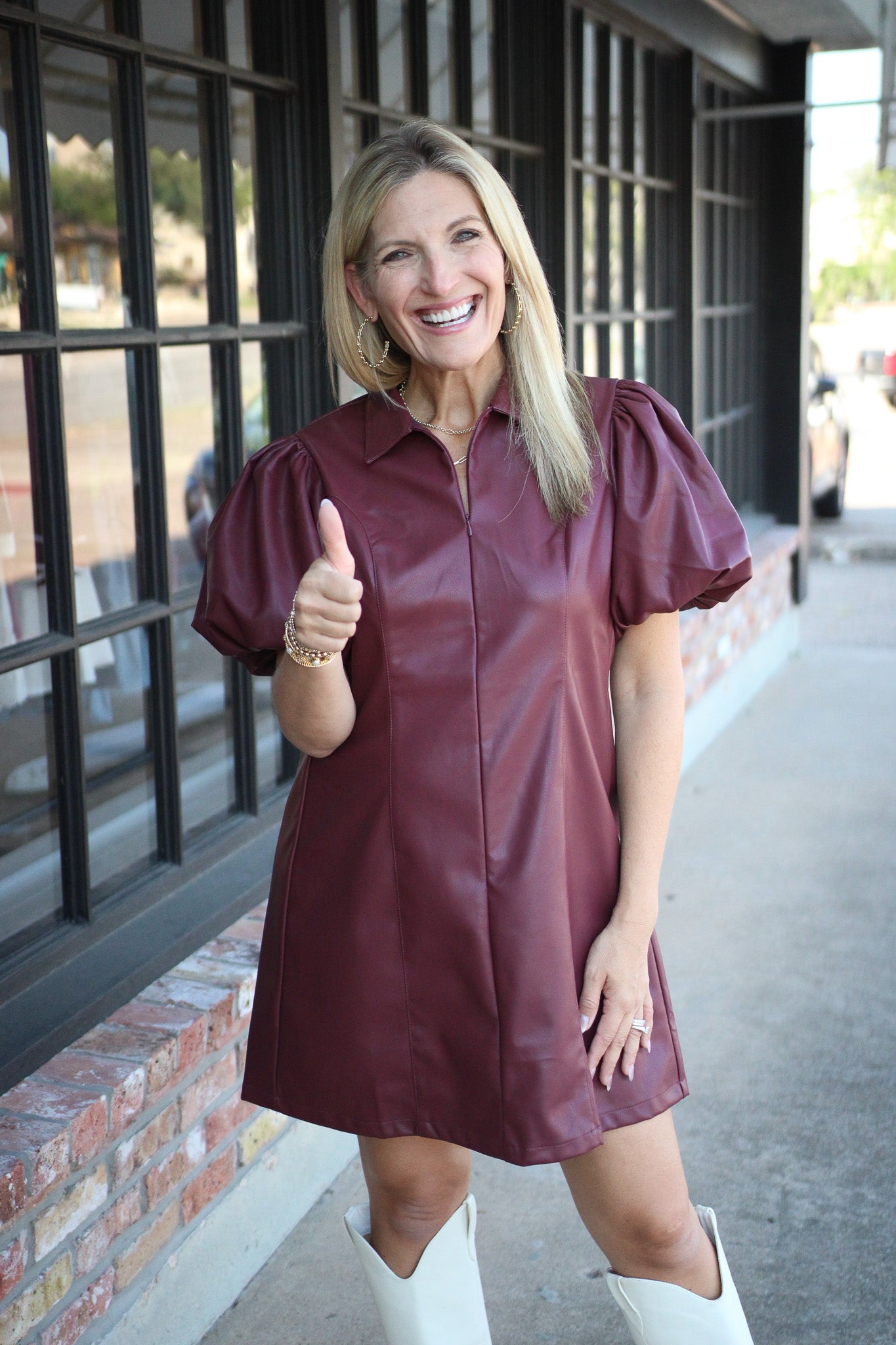 Get game-day ready with the Line Of Style Mini Dress in maroon! Featuring a fun puff sleeve design, a sleek collared neckline, and a functional front zipper, this faux leather mini dress brings edgy flair to your football festivities. Unlined for comfort and easy movement, it’s perfect for cheering on your team in style and confidence.