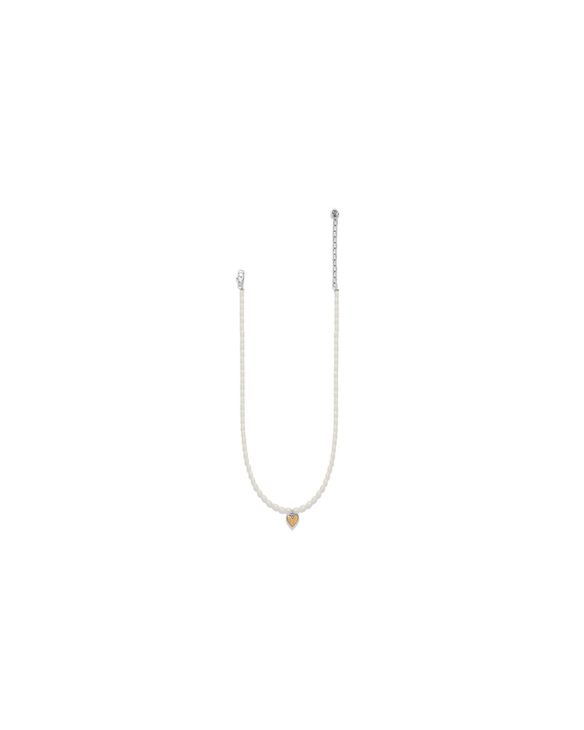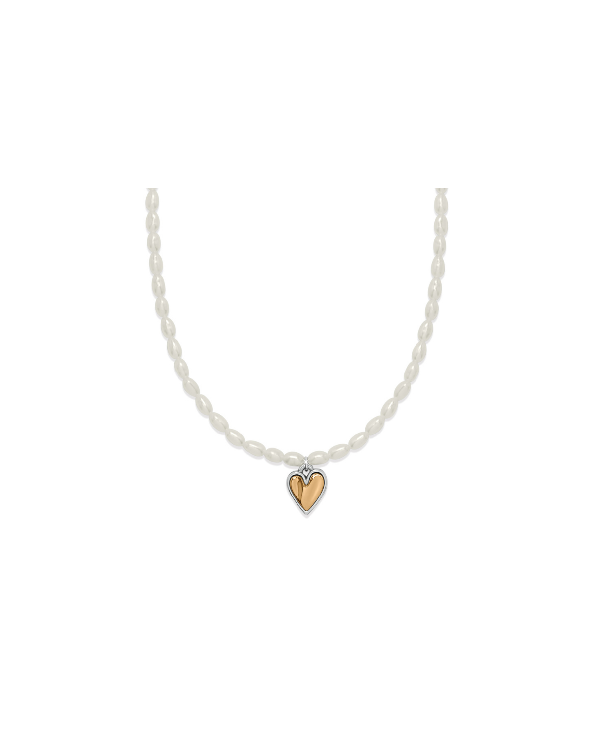 Adding a new element to the collection, freshwater rice pearls add a timeless and elegant touch. The strand of pearls has organic not symmetrical shapes that truly complement this collection. The strands of pearls embrace a single petite two-tone heart at the bottom of the necklace.
