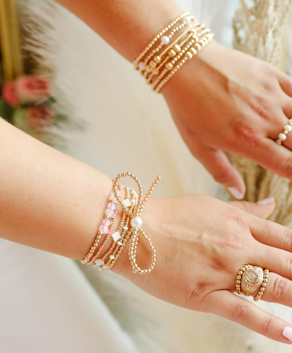 Material: 14 K gold filled beads, acrylic beads, Czech glass beads and durable elastic string.