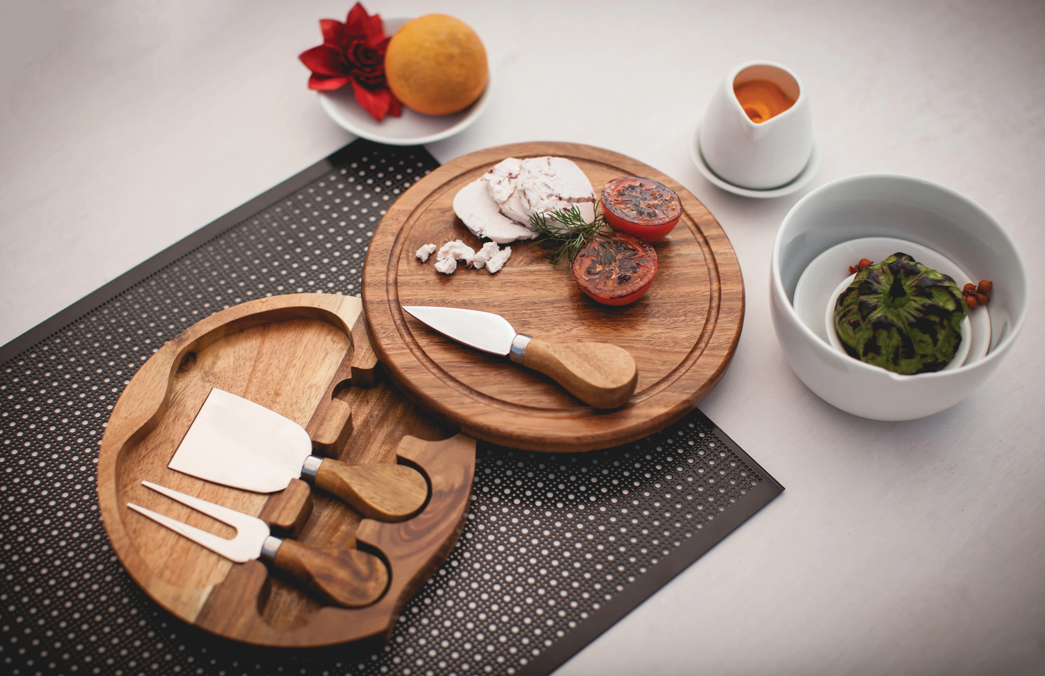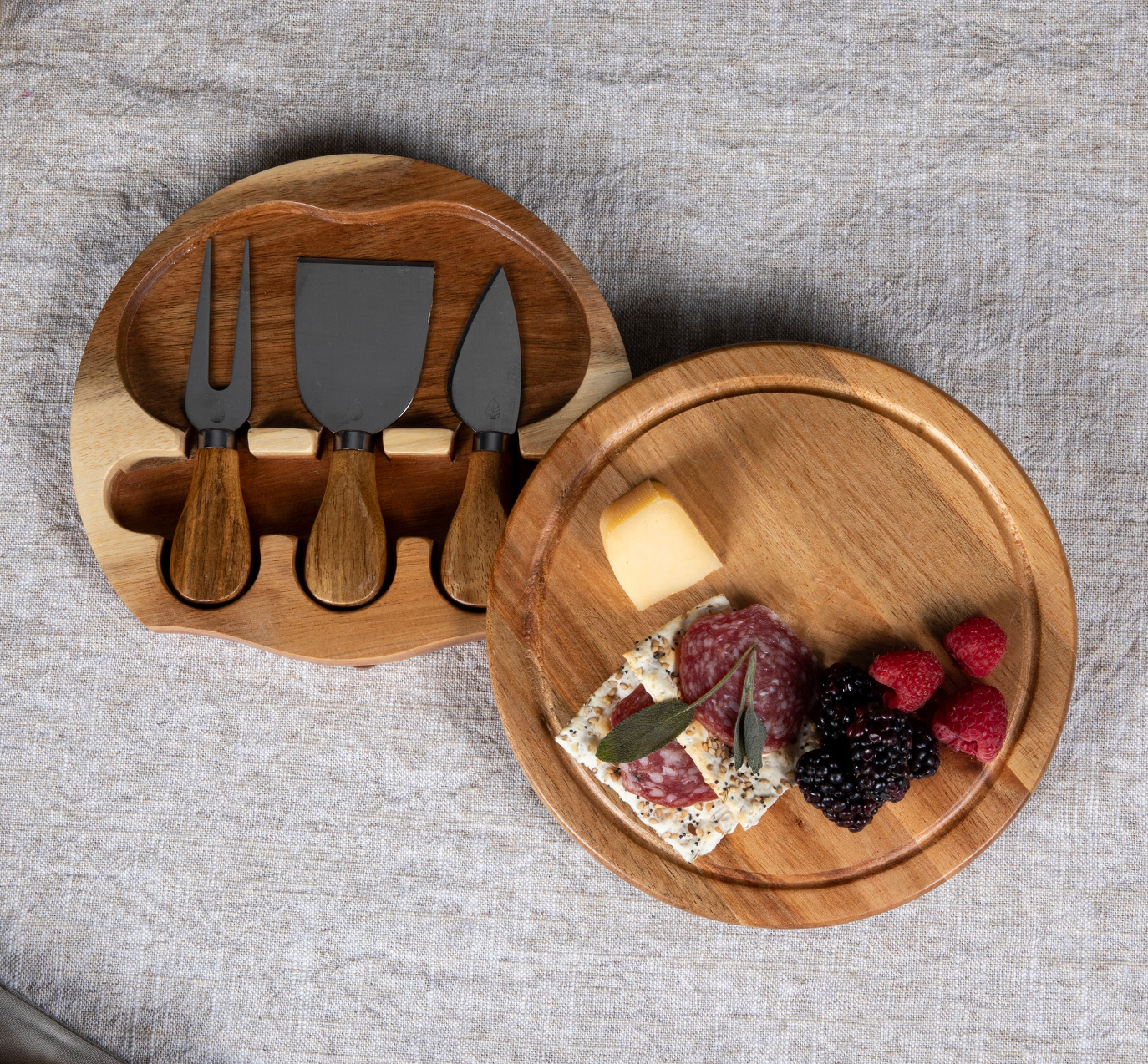 The Acacia Brie Cheese Board and Knife Set is a split-level cutting board that swivels open to reveal three stainless steel cheese tools housed in their own secure grooves.
