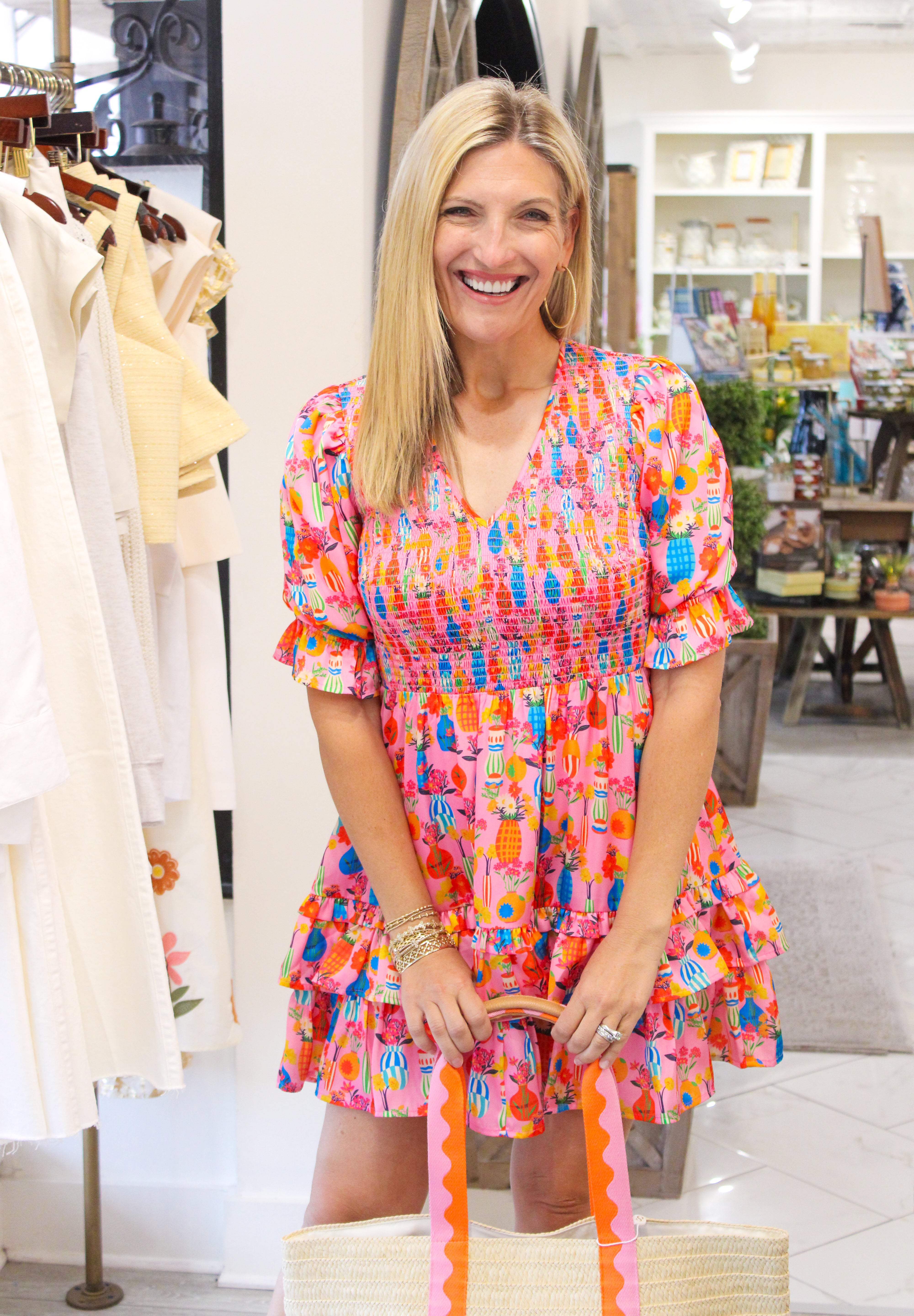 Get ready to turn heads in the Alex Dress, Pink Chantilly. This playful pull-on style features a smocked bust, puff sleeves, and a tiered skirt, all in a silky material. Adorned with colorful flower vases, this fully lined dress is perfect for any occasion with its v neckline.