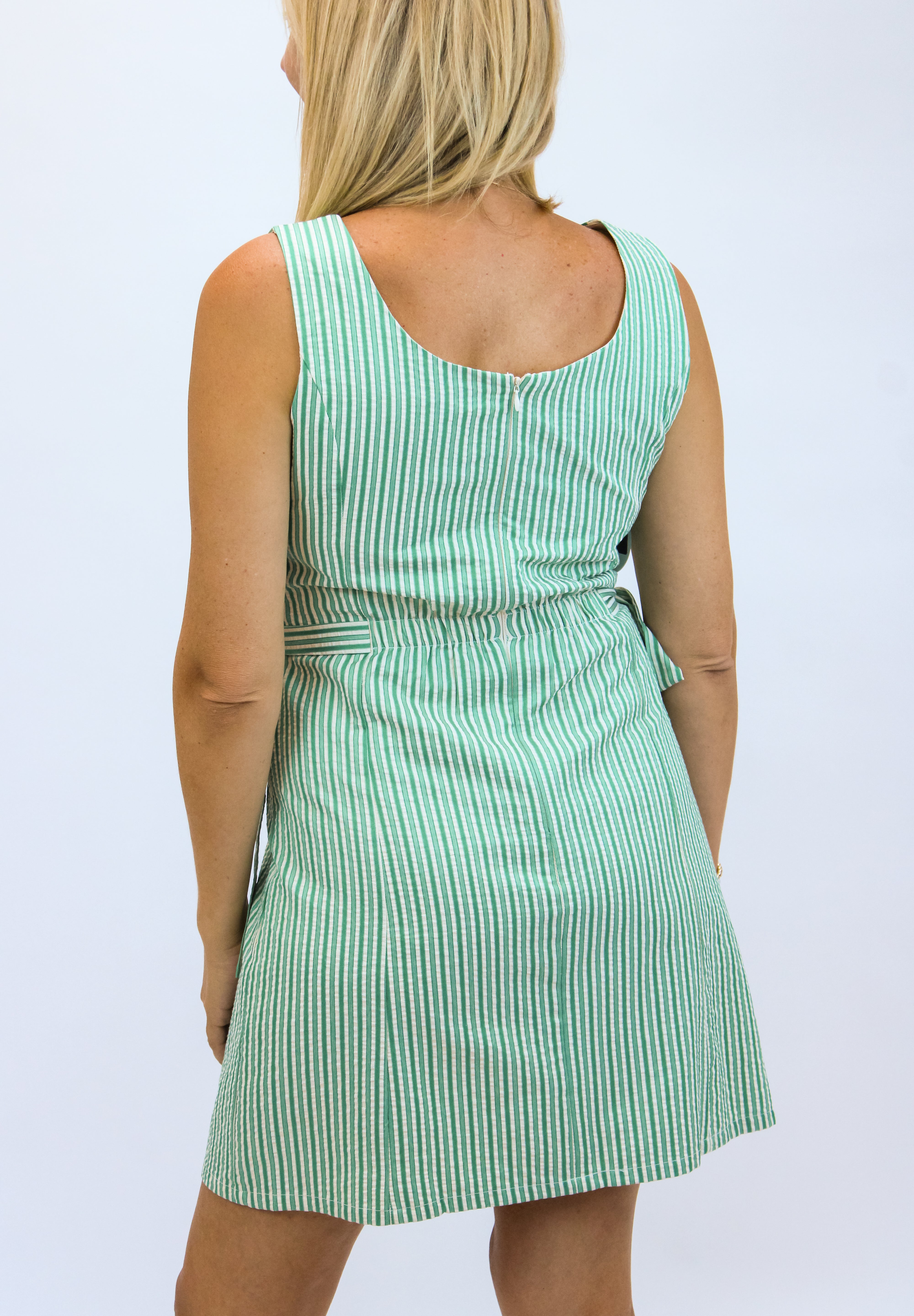 Brighten your wardrobe with this playful mini dress featuring a chic boat neck and breezy sleeveless cut. The green and cream stripes bring a fresh, lively vibe, while adjustable side ties add a fun, flirty touch and a perfect fit. Ideal for sunny days and spontaneous adventures, this dress combines comfort and style effortlessly.
