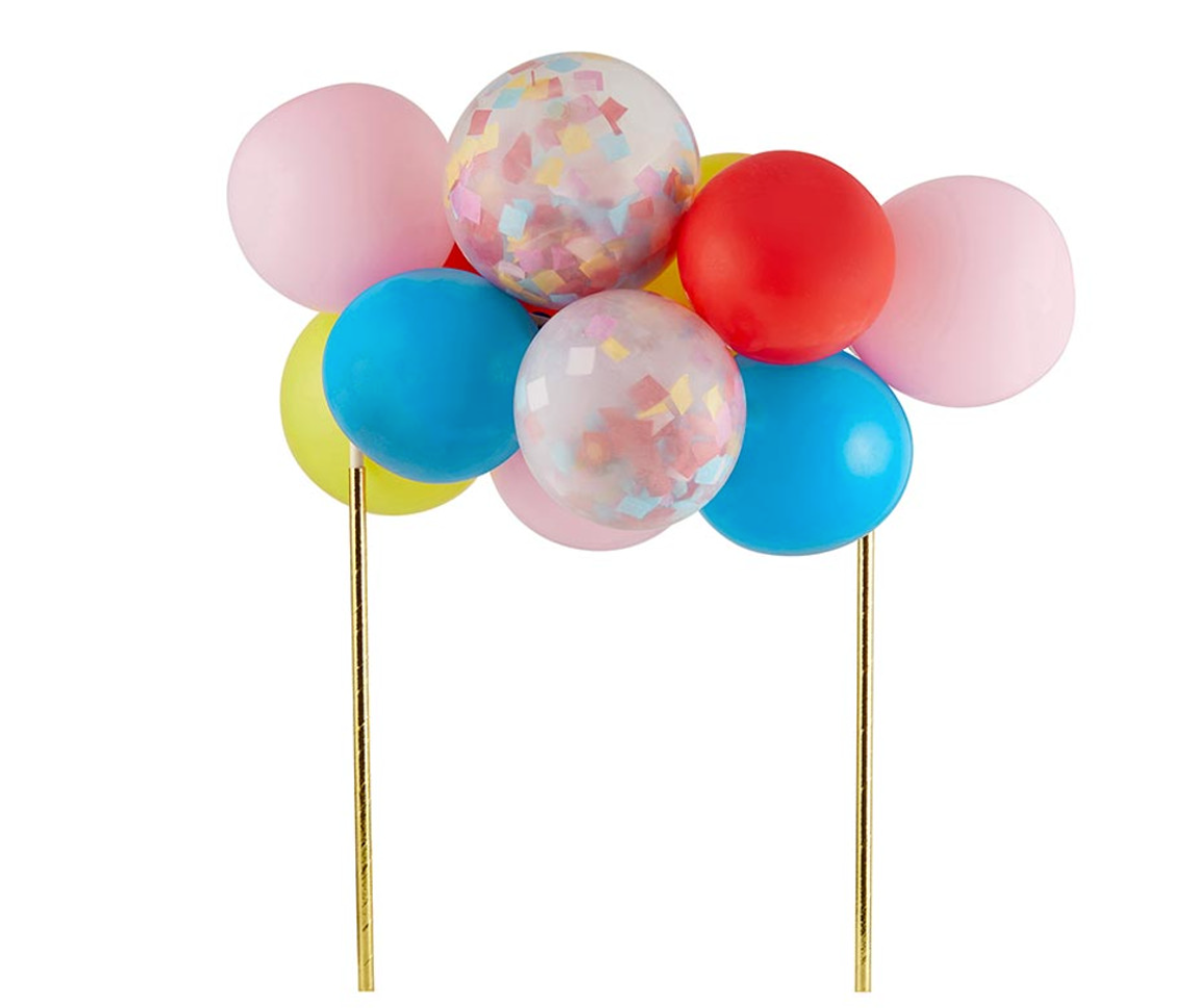 Top any cake in style with this mini balloon cake topper! Includes eleven balloons, with the clear balloons pre - filled with confetti! Self assembly required.