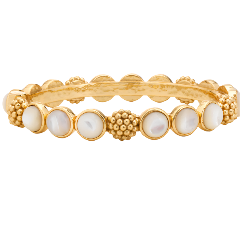 Trios of delectable, polished cabochon gem-drops are united by a sprinkling of golden berries to create this regal bangle that can elevate a pair of jeans or bring the perfect splash of glamor to your lucky business suit, in a snap. Either way, it’s perfect for queening over your to-do list with exquisite style and grace. Stunning on its own, even better in a stack!