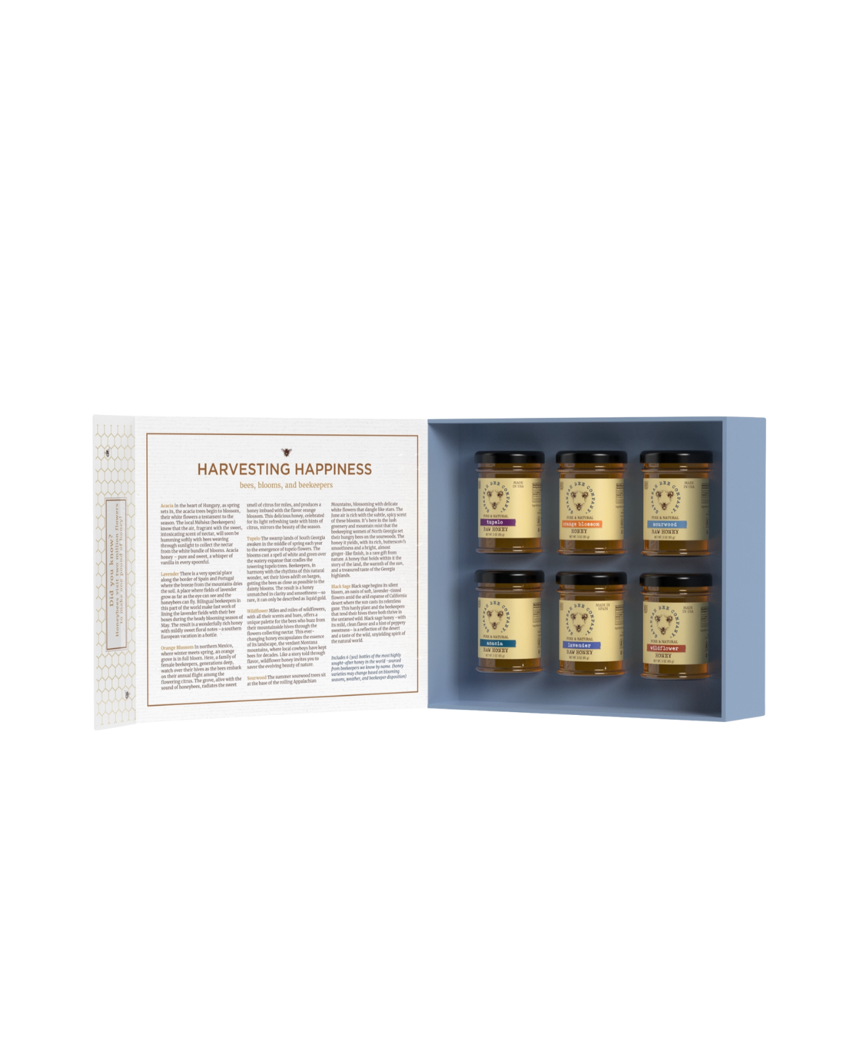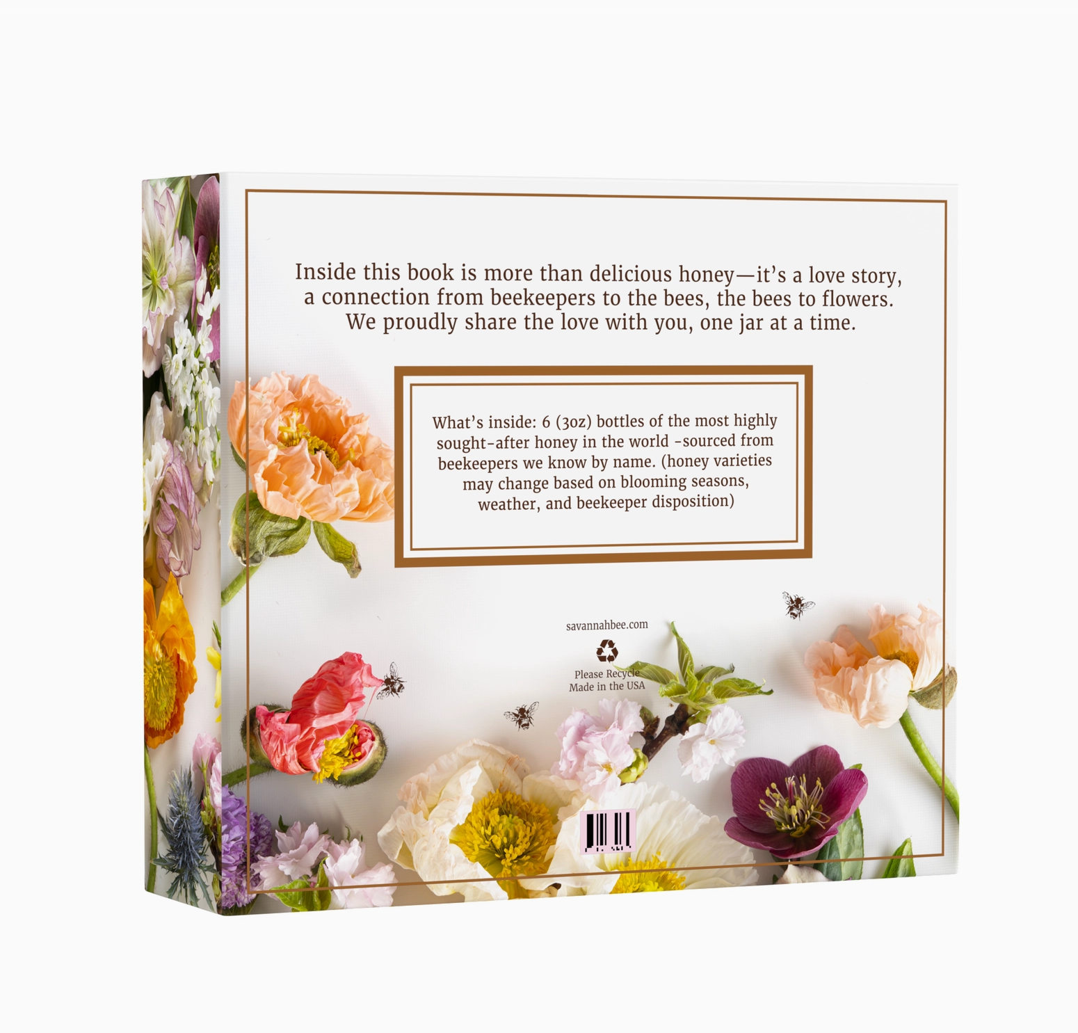 What's inside: 6 (3oz) bottles of the most highly sought-after honeys in the world -sourced from beekeepers we know by name. Selections could include Acacia, Lavender, Orange Blossom, Tupelo, Wildflower, Sourwood, Saw Palmetto, Black Sage or Sunflower – all packaged thoughtfully in a floral-covered “book.” (Honey varieties may change based on blooming seasons, weather, and beekeeper disposition.)