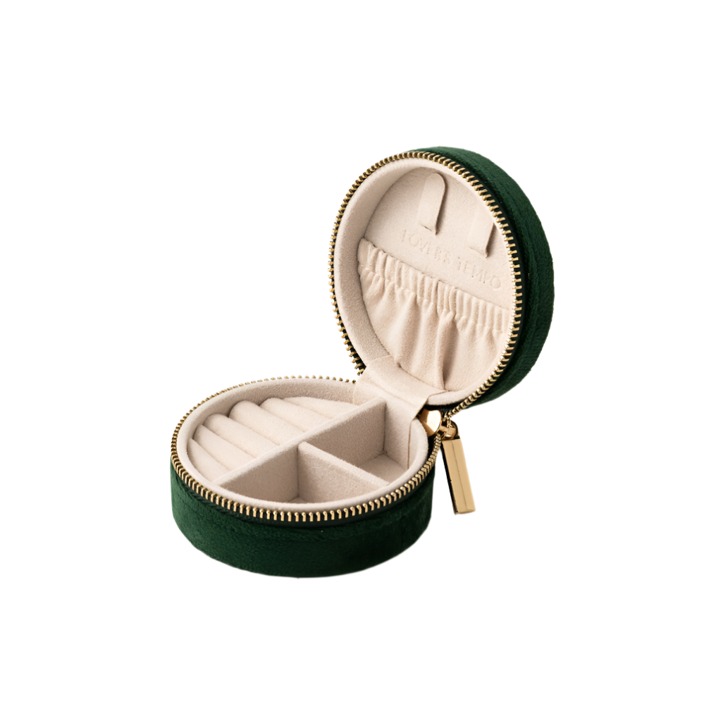 Perfectly compact for your suitcase and equally as elegant for your hotel vanity. Have the peace of mind knowing your most treasured pieces are safely tucked away in this plush circle case.
