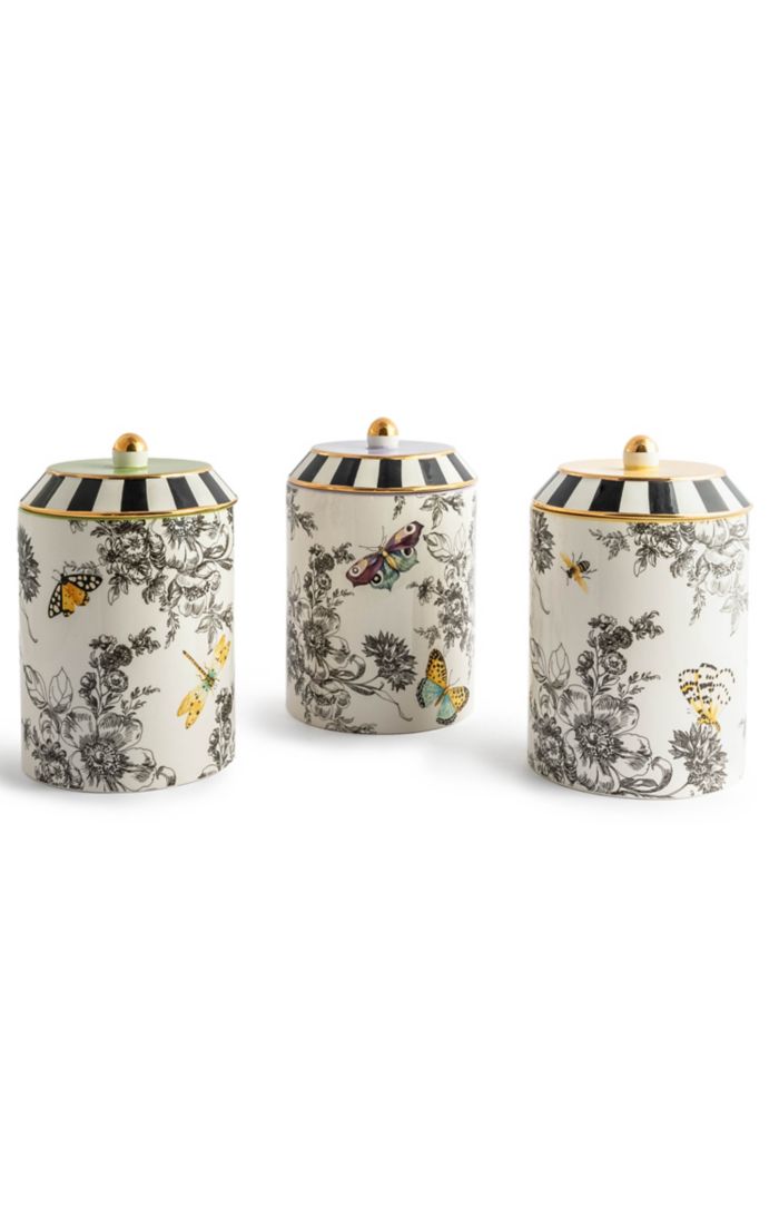 We’re aflutter for these butterfly toile canisters that highlight the butterflies and bees with a pop of color, trimmed with hand-painted stripes and gold lustre on the lids.