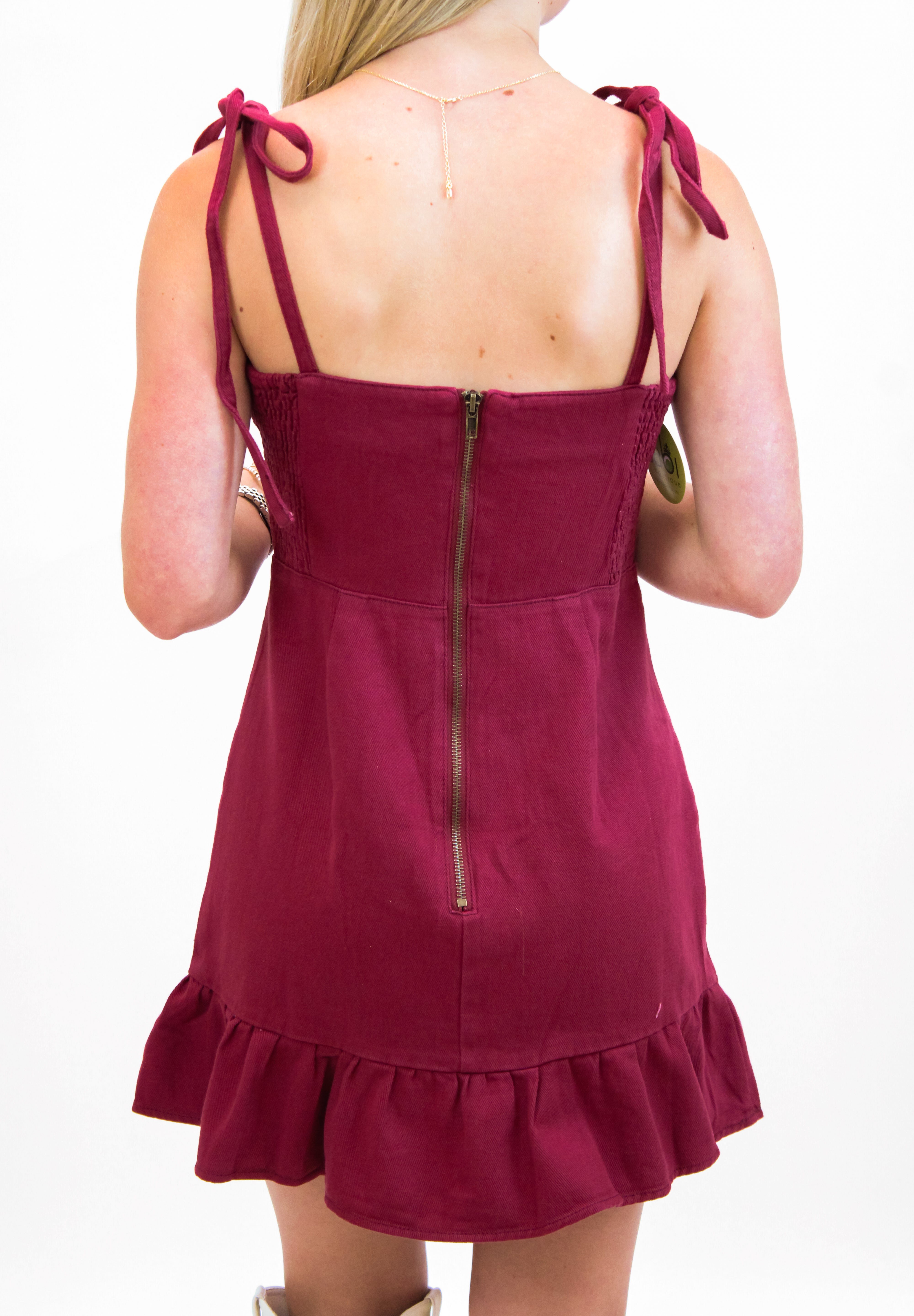 Get ready to turn heads in the Countdown To Kickoff Dress! This maroon denim mini dress features playful ruffle hems and charming shoulder tie straps, adding a flirty touch to your game day look. Perfect for cheering on your team in style and comfort.