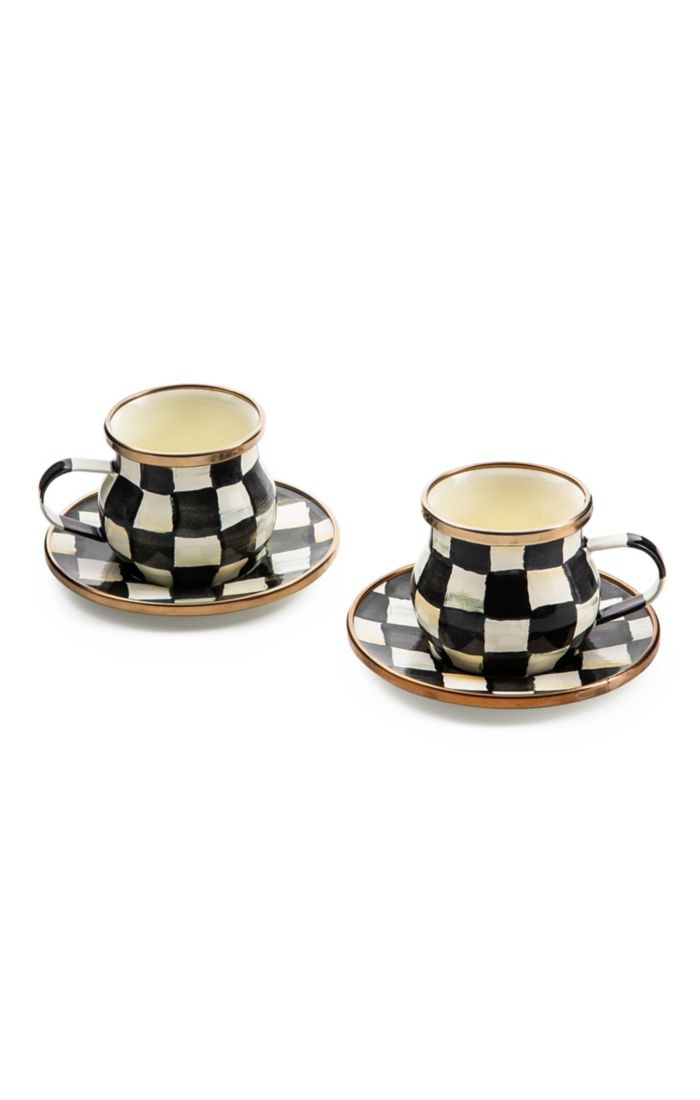 Heavy-gauge, hand-glazed steel underbody with hand-painted Courtly Checks, rimmed in bronzed stainless steel. Pieces may vary due to the handmade nature of each product. Imported. Set includes 2 cups and 2 saucers.