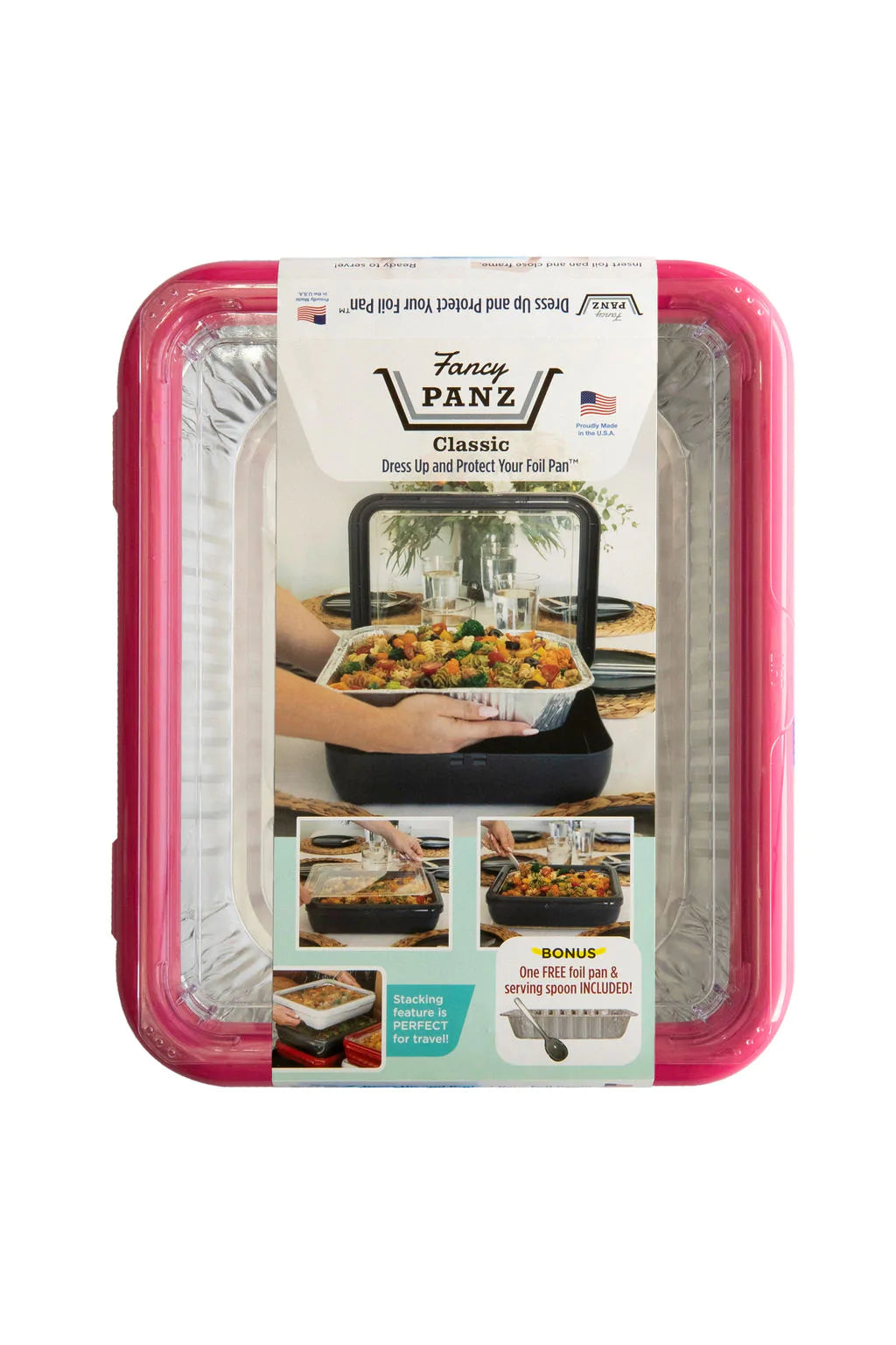 Fancy Panz is the answer to those flimsy, not so pretty foil pans! Enjoy all the conveniences of a foil pan and dress it up in a Fancy Panz Classic! No more grimypans to scrub or dirty serving dish to bring home- just remove the foil pan and and wipe down your Fancy Panz! Potlucks, Parties, Tailgates, BBQ, Picnics, Home and an Awesome Hostess Gift! Take hot or cold food to your next event in a foil pan placed in a decorative Fancy Panz. The ribbed bottom is designed for air flow to help maintain food temperature. When it's time to serve, remove the clear cover and place it under your Fancy Panz where it now becomes a trivet! Leaving the party early? Simply remove the foil pan and leaveyour food at the event or dispose of the foil pan. home! No more dirty dishes to bring home and NO MORE LOST SERVING DISHES! Travel - Fancy Panz are stackable and sturdy for ease while traveling! You can't say that about your foil pans!