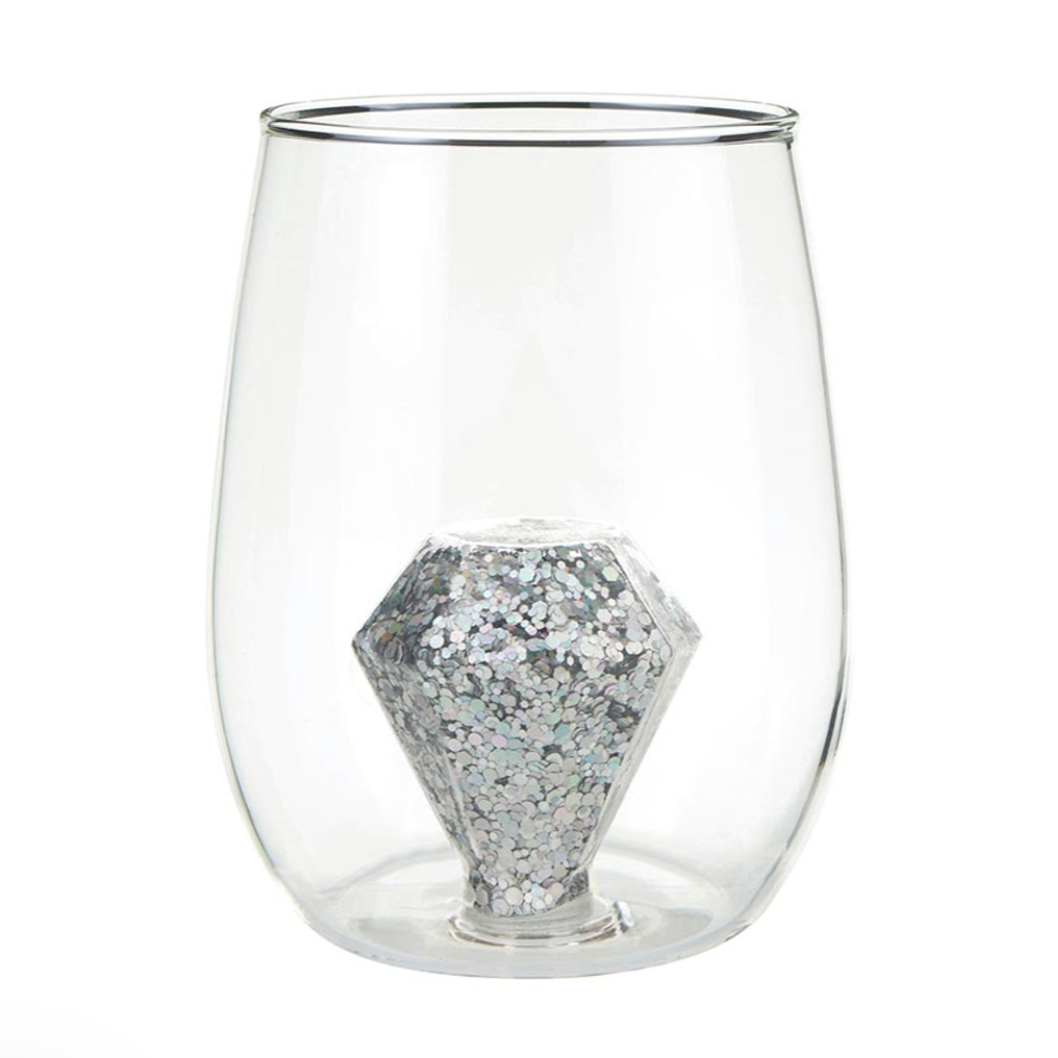 Celebrate your love with our Stemless Wine Glass, featuring a stunning diamond figurine filled with sparkling silver glitter, adding a touch of elegance to your special day.
