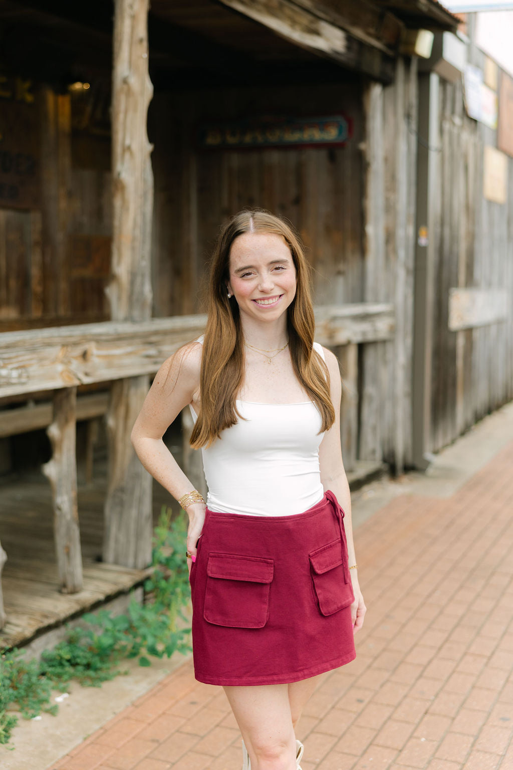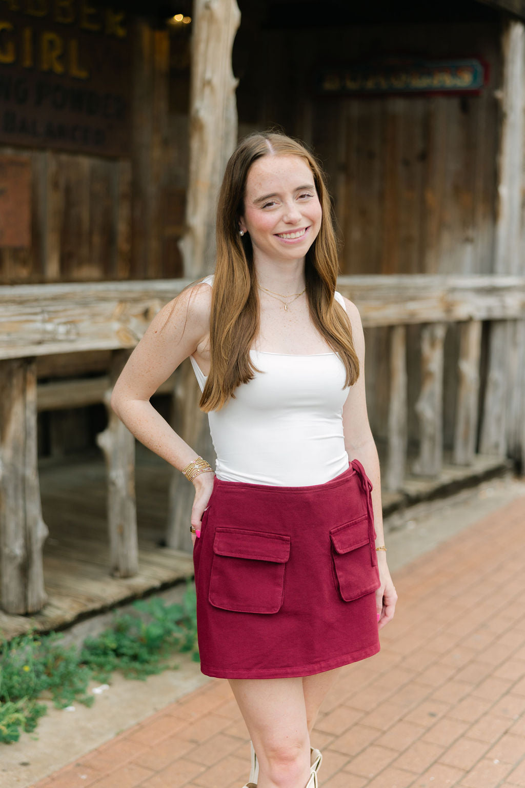 Get ready to show off your glowing confidence with our Glow Up Mini Skort in Maroon. Made with denim material, this skort features a zip front closure, front pockets, and a side tie accent. And with no stretch, you'll rock a unique style all night long. Perfect for a fun night out!