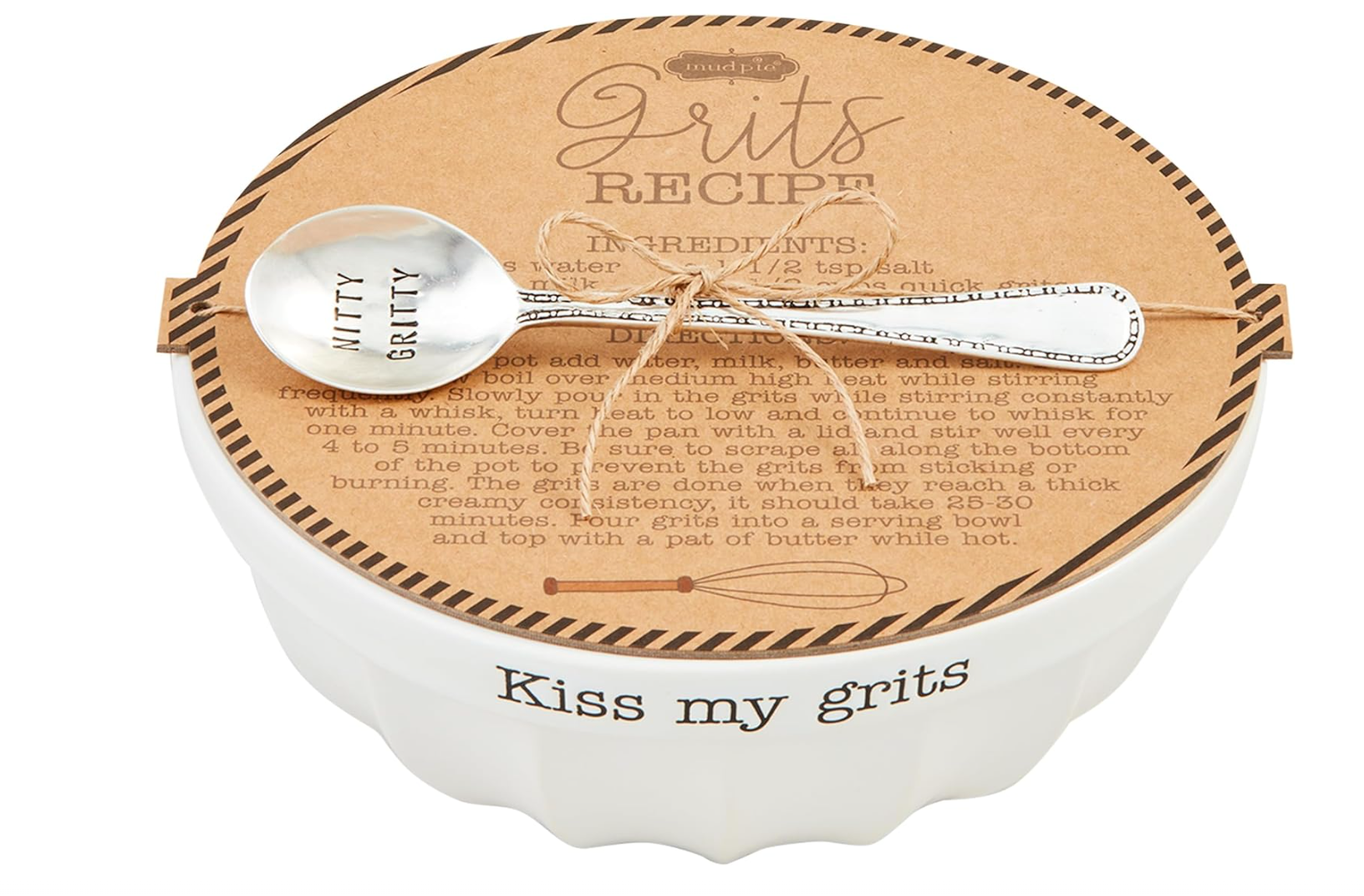 - The Grits Bowl Set is a 2-piece set that includes a textured ceramic bowl and a stamped silverplate spoon
