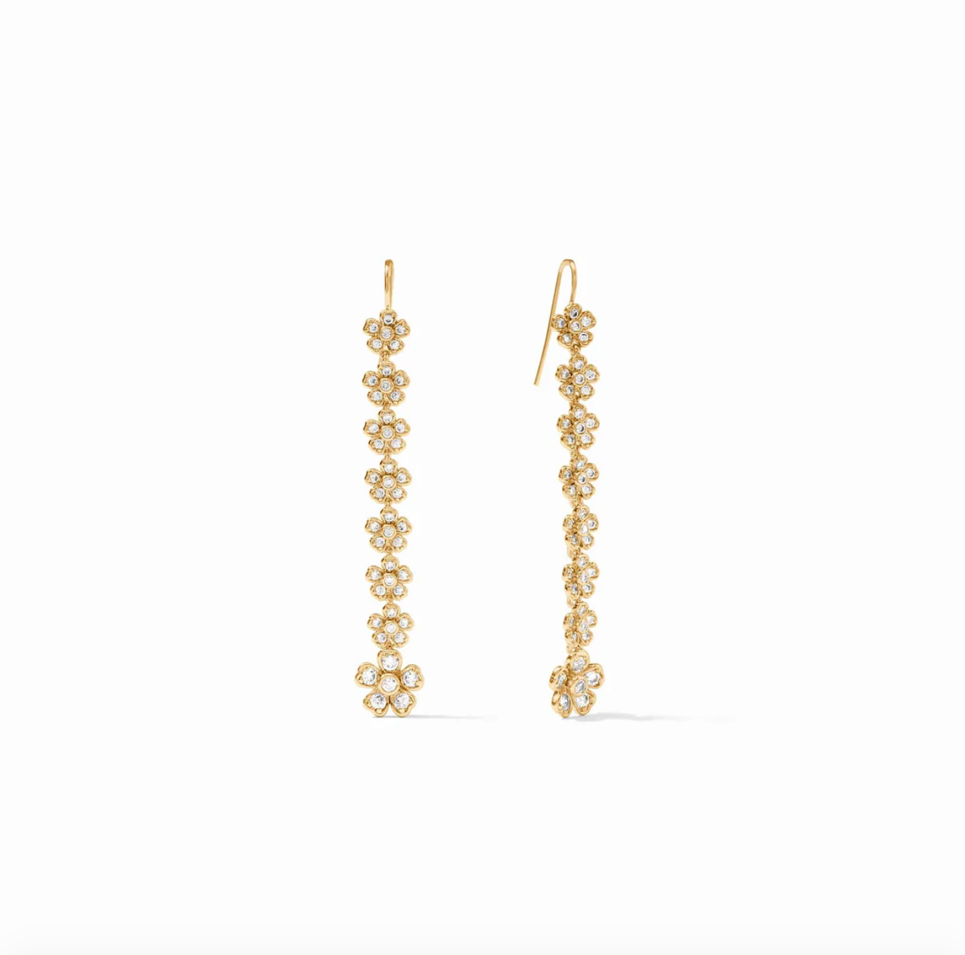 Seven petite pavé and gold flowers blossom, swing, and sway in a brilliant column, anchored by a larger bloom at the base.