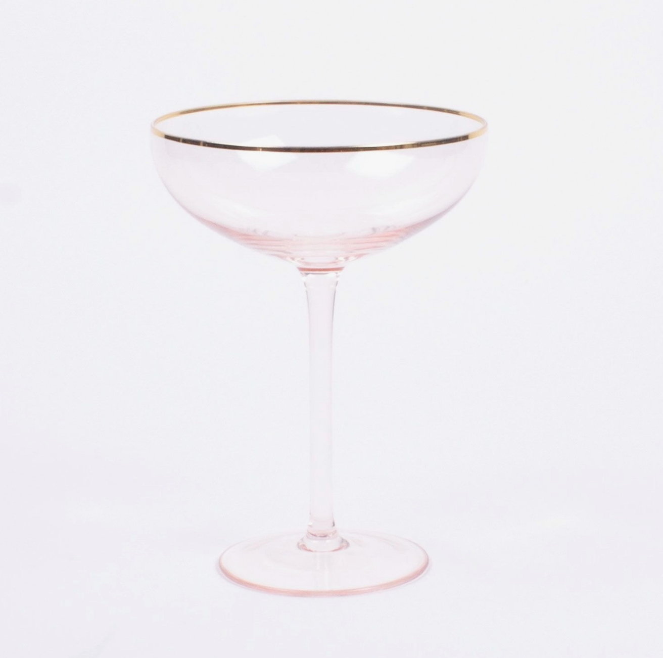 Look no further than this exquisite Light Pink Coupe Glass to elevate your intimate gathering or special occasion. Crafted with a unique pale pink tint and gold rim, our beautiful glass is sure to impress. This elegantly elegant glass holds 7 ounces of liquid and is perfect for hosting bridal showers, baby showers, girls’ nights in, or any other celebration where you wish to raise a fittingly sophisticated toast. At 4.75" x 6.5" x 3.25", the handmade piece is entirely designed in the USA and imported for your pleasure, making it a timeless piece on which you and your guests can sip in style. Best of all, for added convenience, it's hand wash recommended for optimal use every time! So be sure to make an unforgettable impression with our magical Light Pink Coupe Glass! Holds 7 Ounces of Liquor 4.75" x 6.5" x 3.25" Pink Tinted Glass with Gold Rim Hand Wash Recommended Designed in the USA; Imported