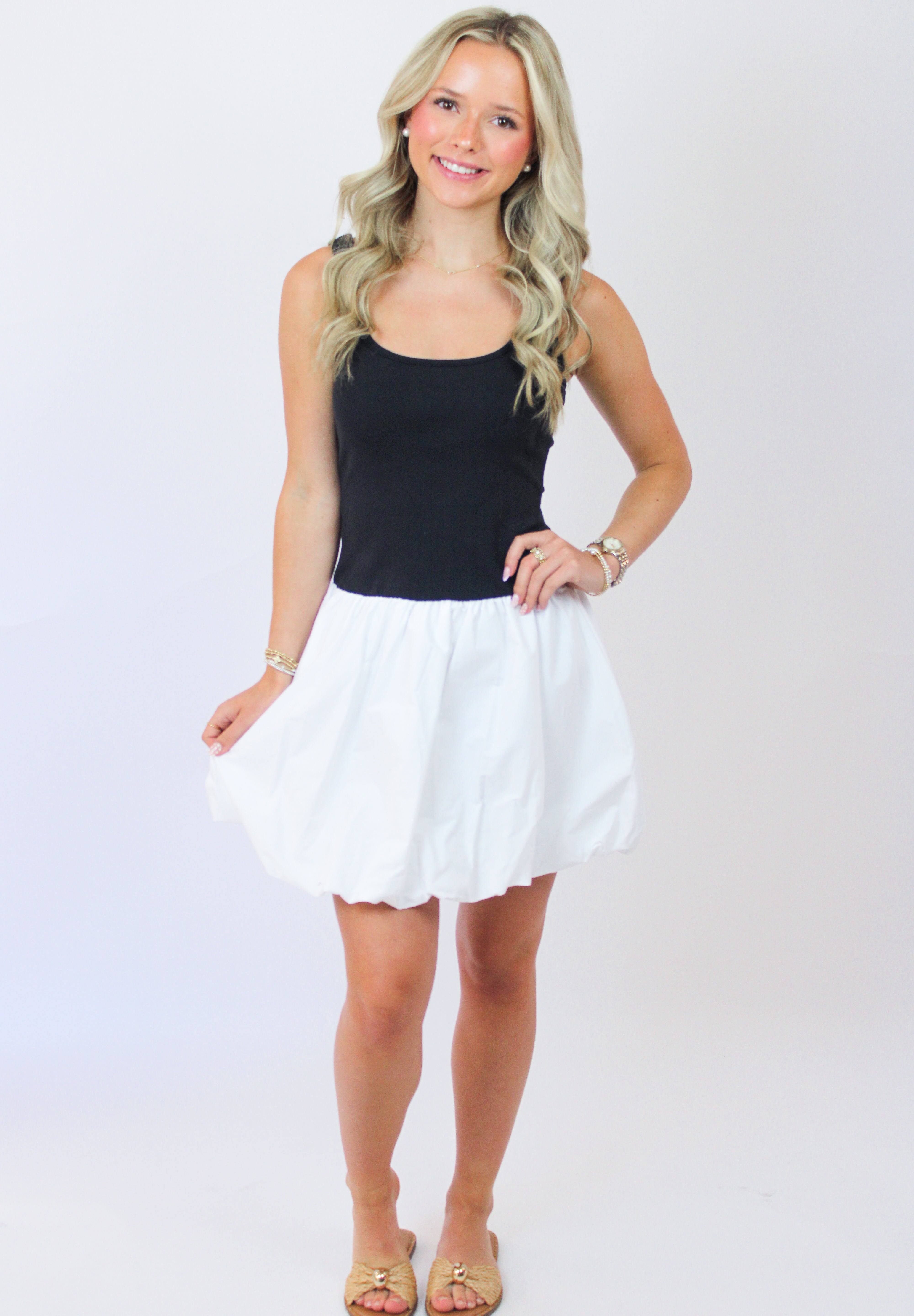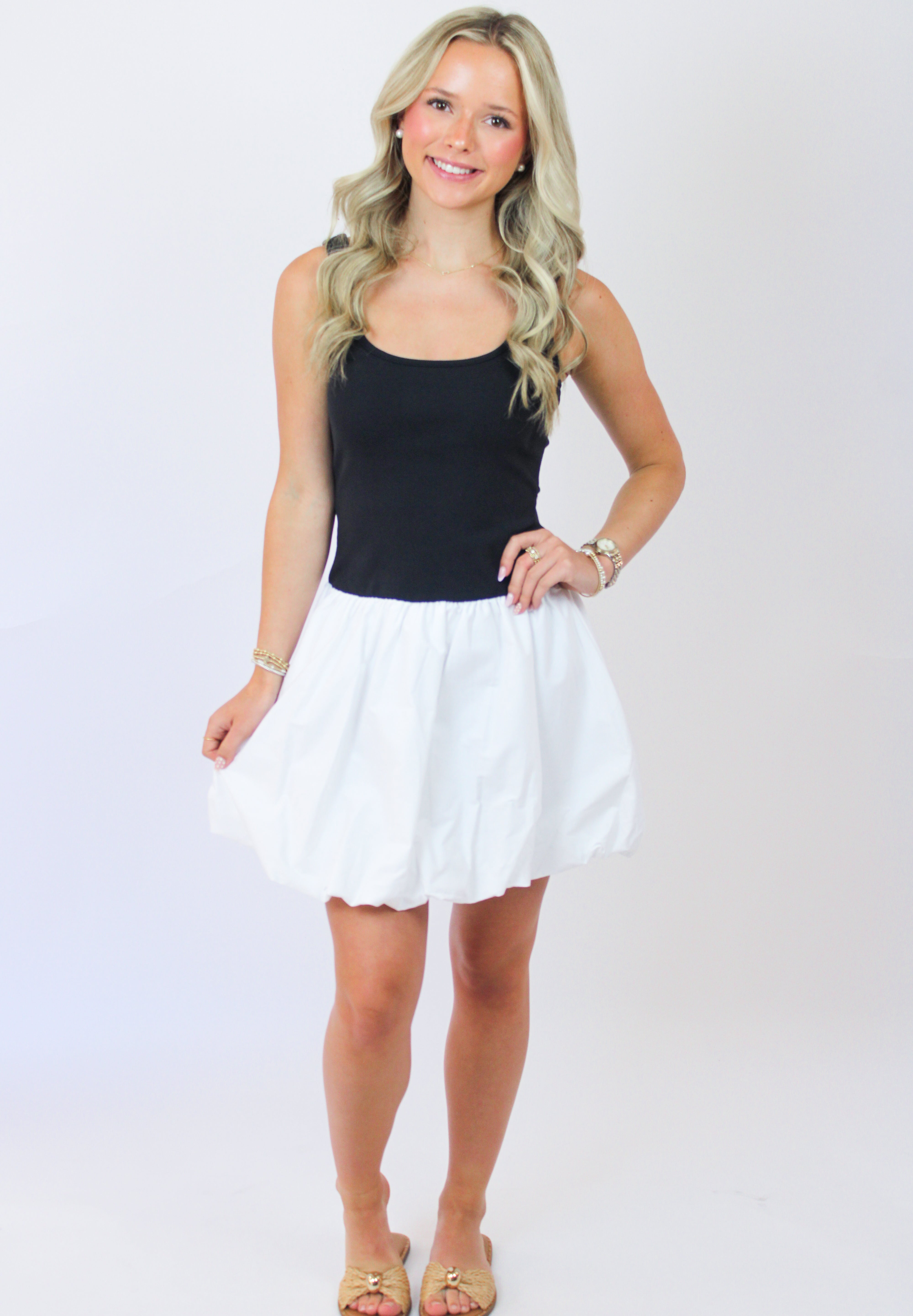 Step into monochrome magic with our Linnea Dress! This playful black and white number features a snug ribbed top that hugs in all the right places, while the bouncy bubble skirt adds a dash of fun to your strut. It's the perfect mix of sassy and sweet – just like you!