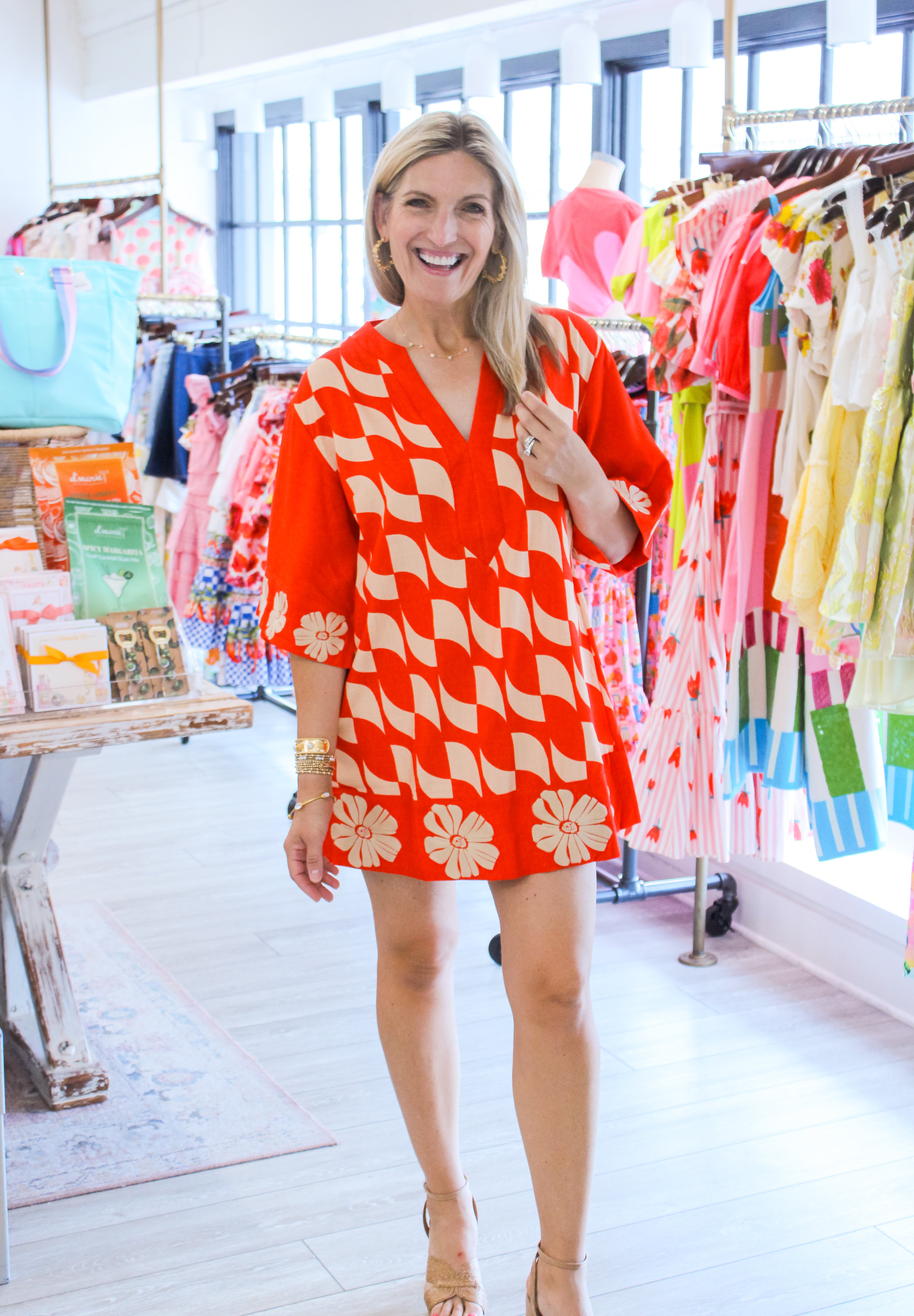 This playful mid-sleeve dress features a flattering v-neck and a charming cream-colored pattern adorned with delicate floral accents. Light and breezy, it’s the perfect choice to brighten up your summer wardrobe with effortless style and comfort.