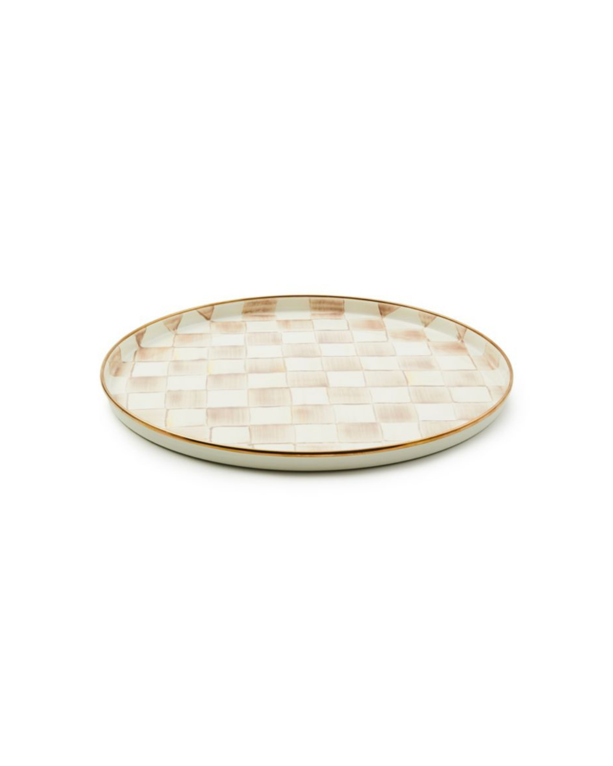 Heavy-gauge, hand-glazed steel with hand-applied Mocha Check decoration and bronzed stainless steel rim. Pieces may vary due to the handmade nature of each product. Imported.