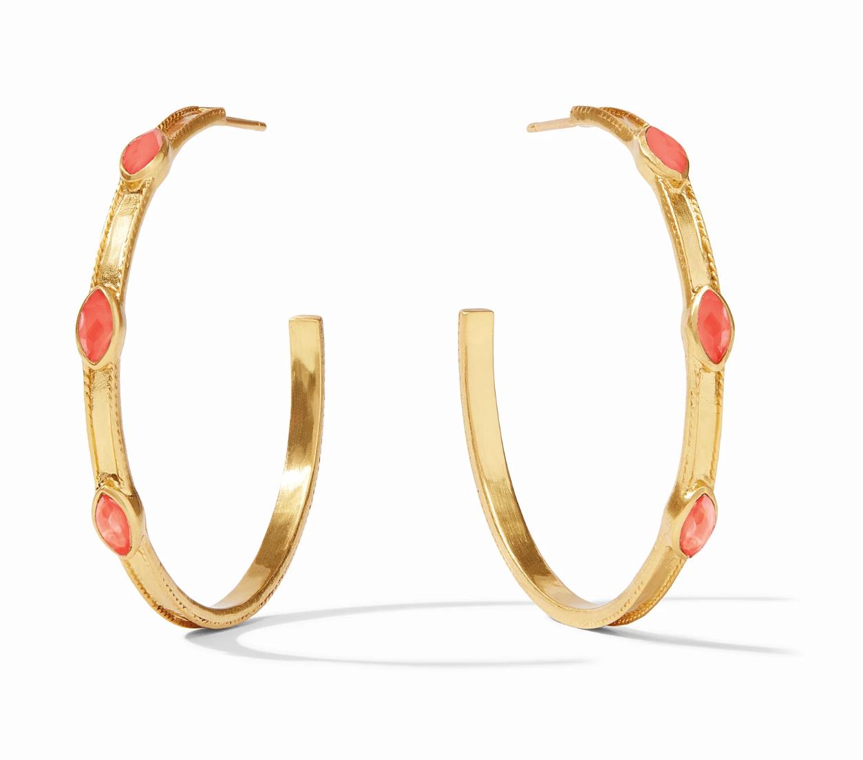 Each one of these slim hoops with a delicate twisted wire border are dotted with a trio of marquise gemstones along the front ridge, adding a judicious amount of sparkle that feels right for day and night.
