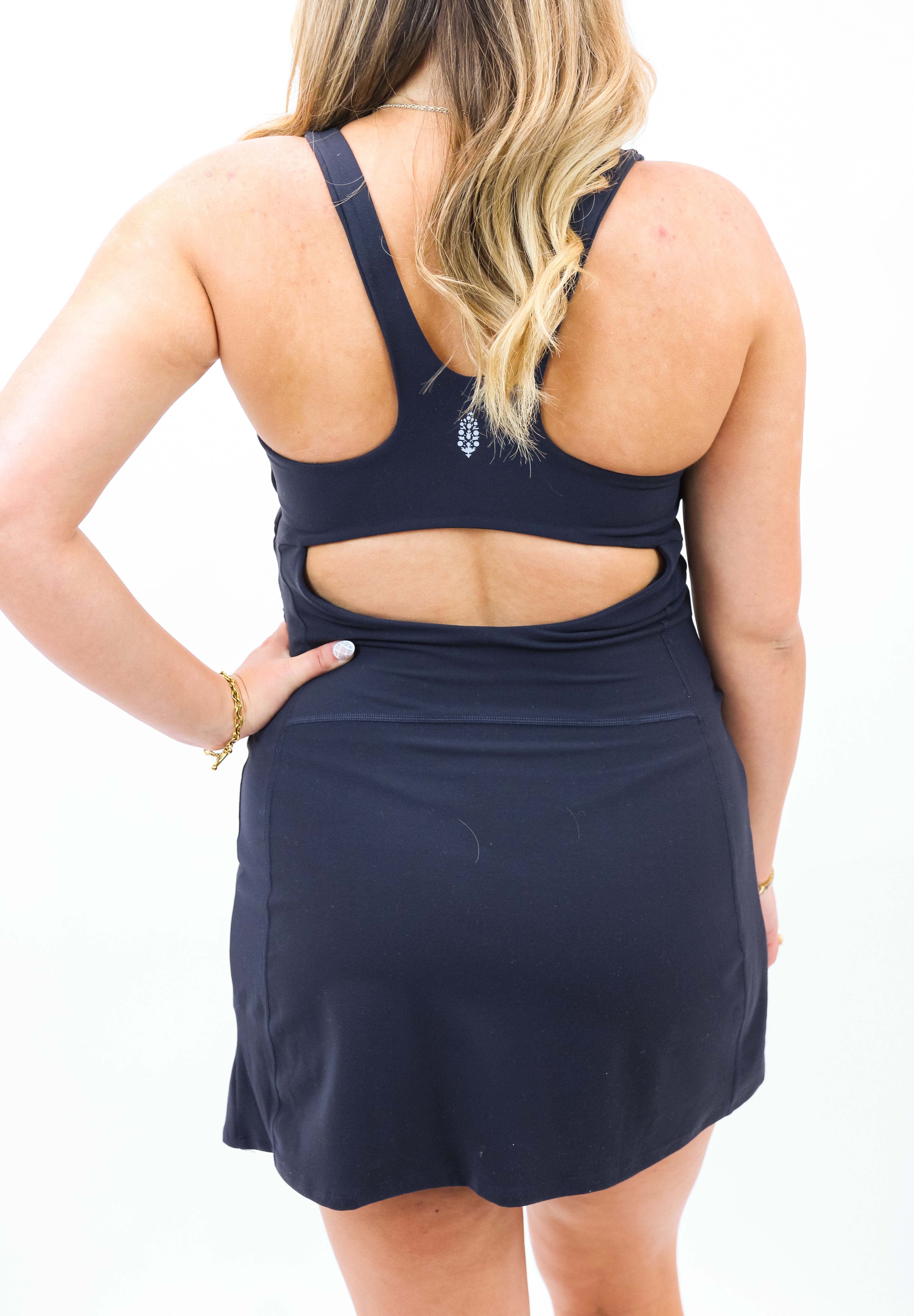 Fit: Fitted; racer-back; low back cutout; built-in shorts are micro-length; dress is shorty-length