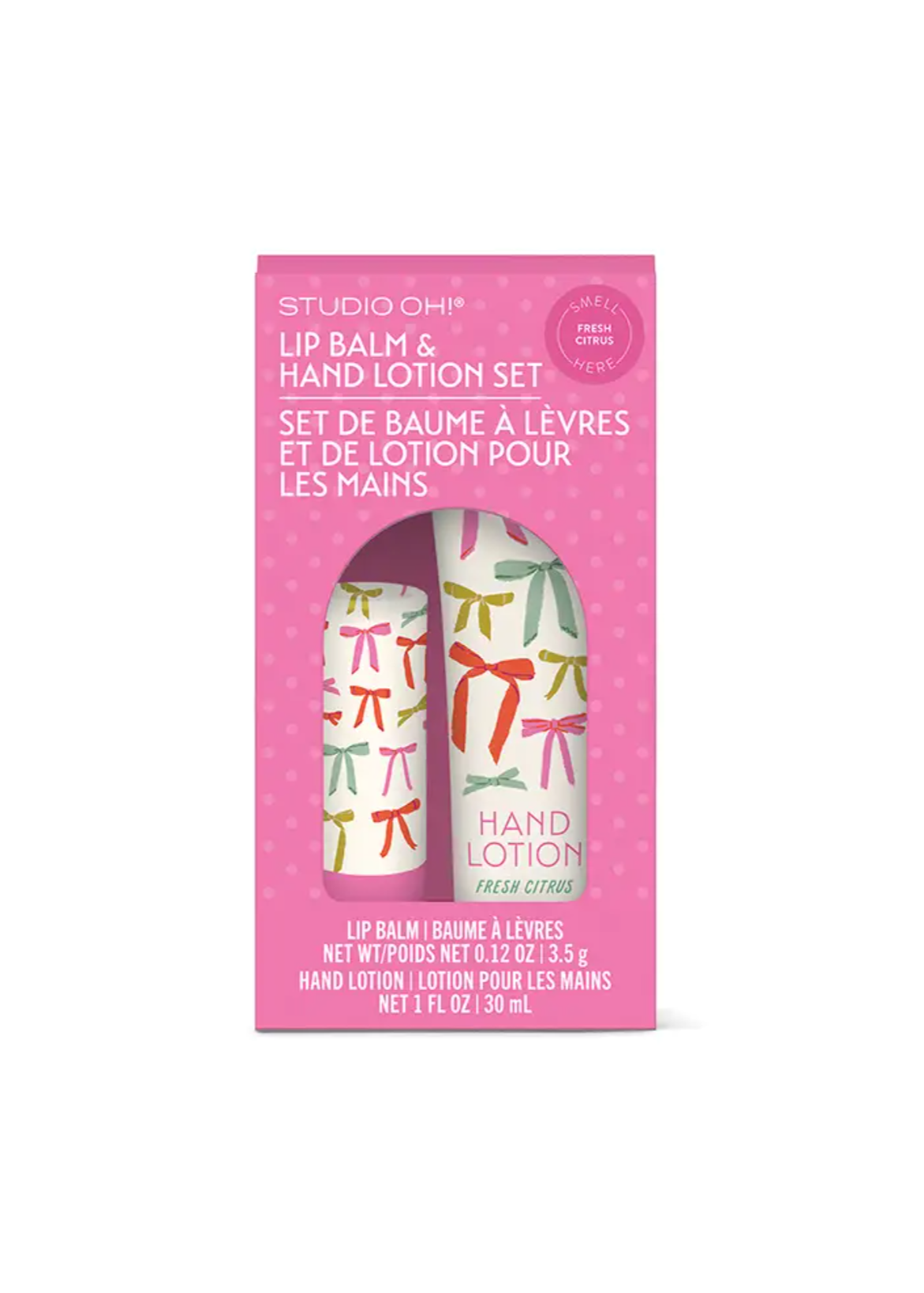 The Lip Balm & Hand Lotion Set from Studio Oh! includes a 1 oz hand cream and lip balm packaged in a clear, reusable pouch. The unscented lip balm helps gently moisturize and smooth dry lips, while the scented hand lotion hydrates hands and cuticles. The two-piece set is artfully designed and perfect for carrying in a handbag or gifting to a friend.