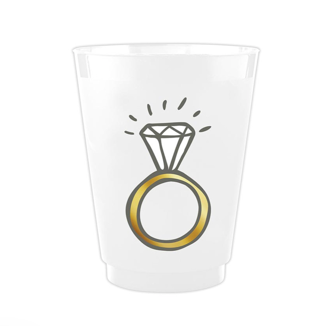Frosted party cup featuring a gold foil ring pattern, adding a touch of elegance to wedding celebrations.