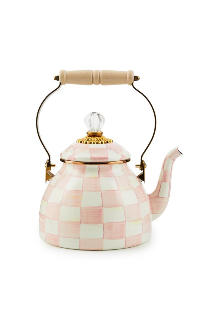 Bubbling over with MacKenzie-Childs style, our Rosy Check Enamel 2 Quart Tea Kettle will have you finding new reasons to put the kettle on. The heavy-gauge steel underbody is glazed with hand-painted, color-dragged checks in a range of rosy hues and topped with an elegant clear glass knob.