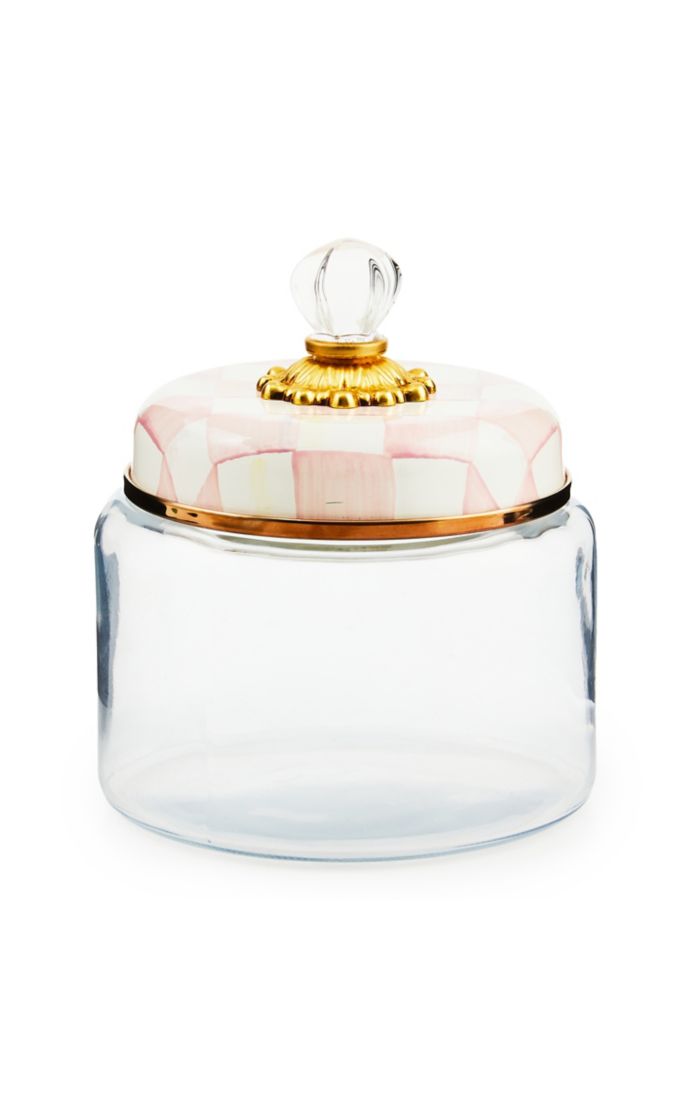 Glass canister and heavy-gauge enameled steel lid rimmed in bronzed stainless steel with faux cinnabar and brass accents. Pieces may vary due to the handmade nature of each product.