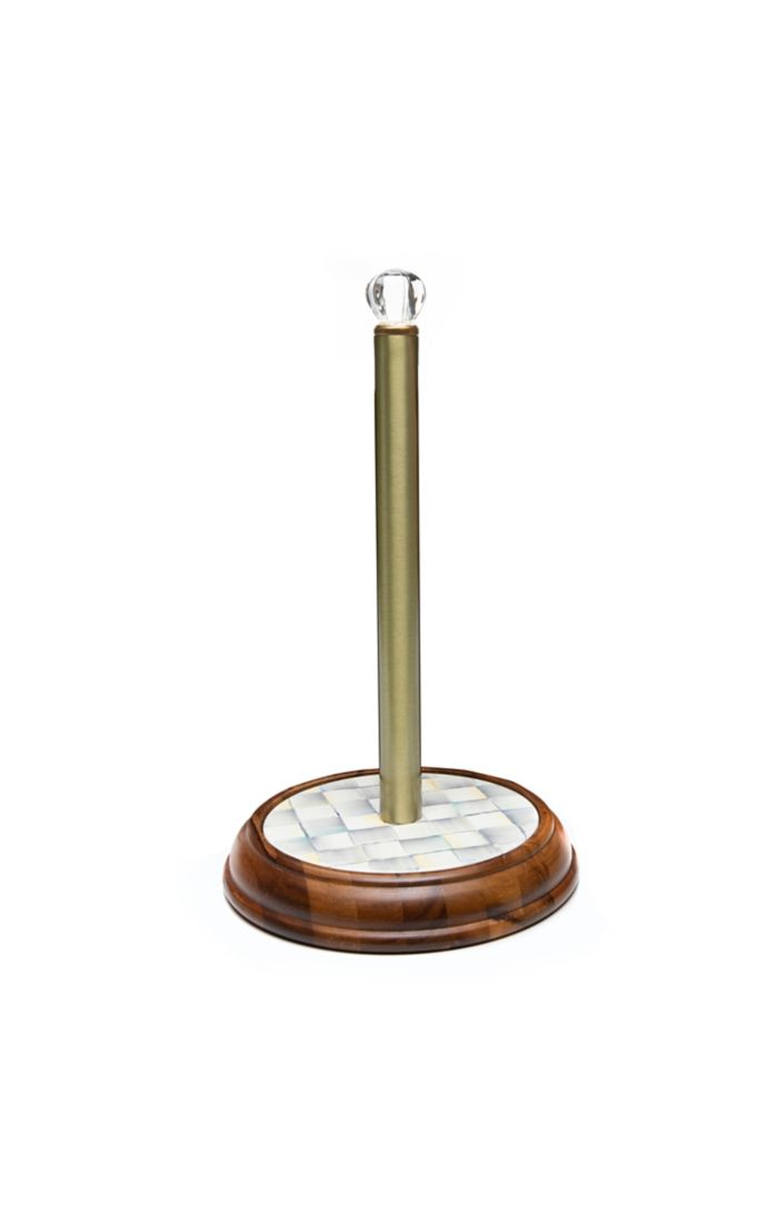 Every kitchen needs a paper towel holder, so make it a Sterling Check Paper Towel Holder! It features hand-painted, color-dragged checks in a range of grey hues on enamel with a wood base, stainless-steel center post, and an elegant clear glass finial.