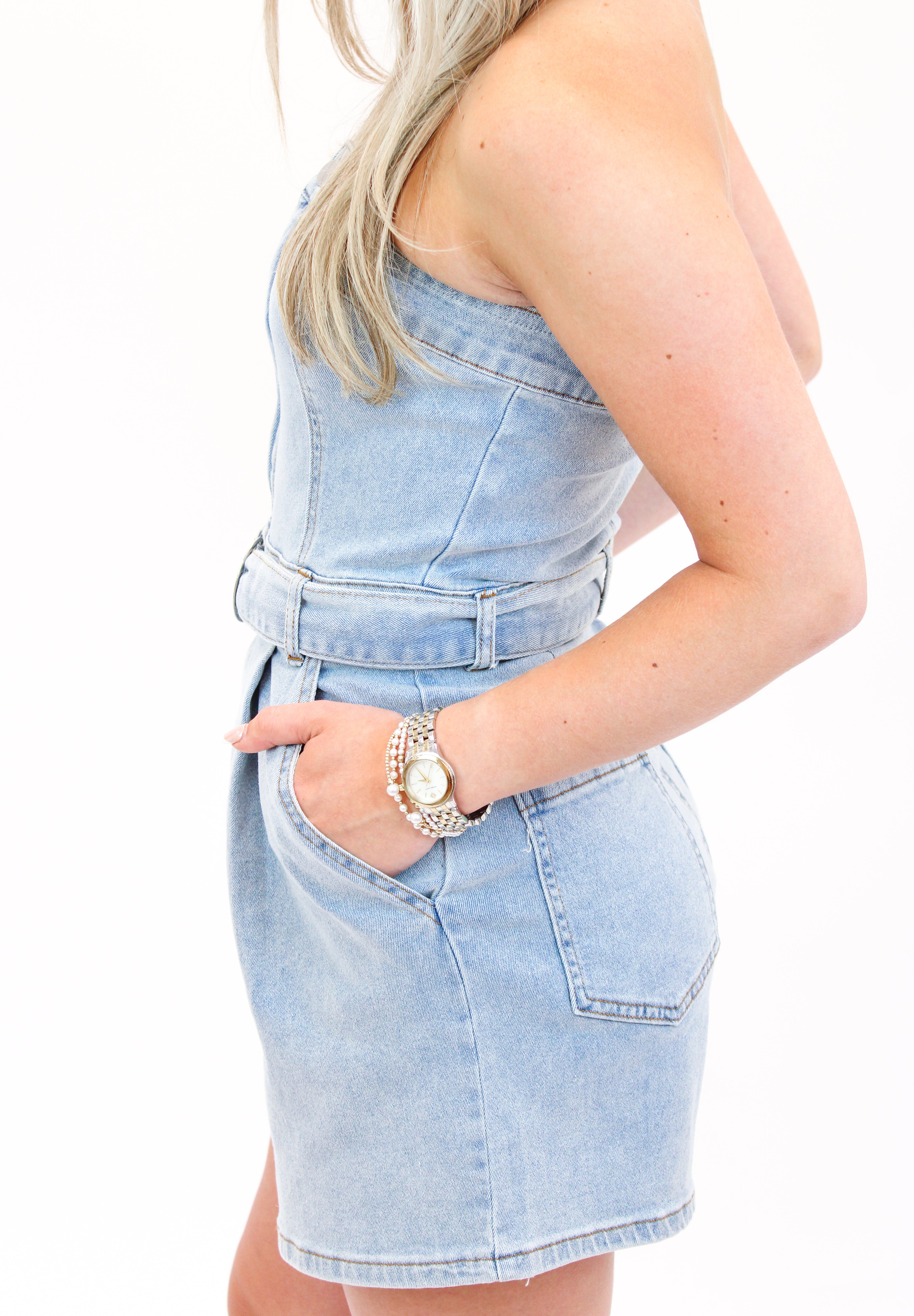 Score a touchdown with the Tailgate Belle Denim Romper! This washed denim tube romper comes with a detachable belt, perfect for showing off your gameday spirit. Look cute and stylish while cheering on your favorite team. Game on!