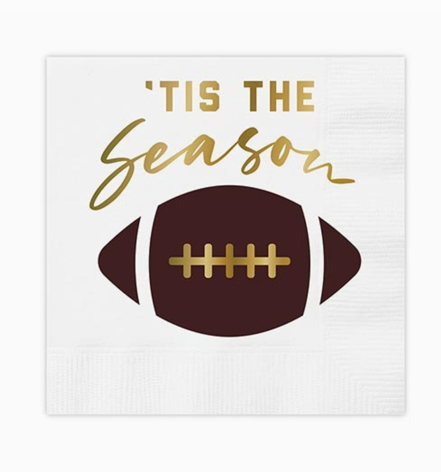 • White napkin features gold foil lettering with football image.