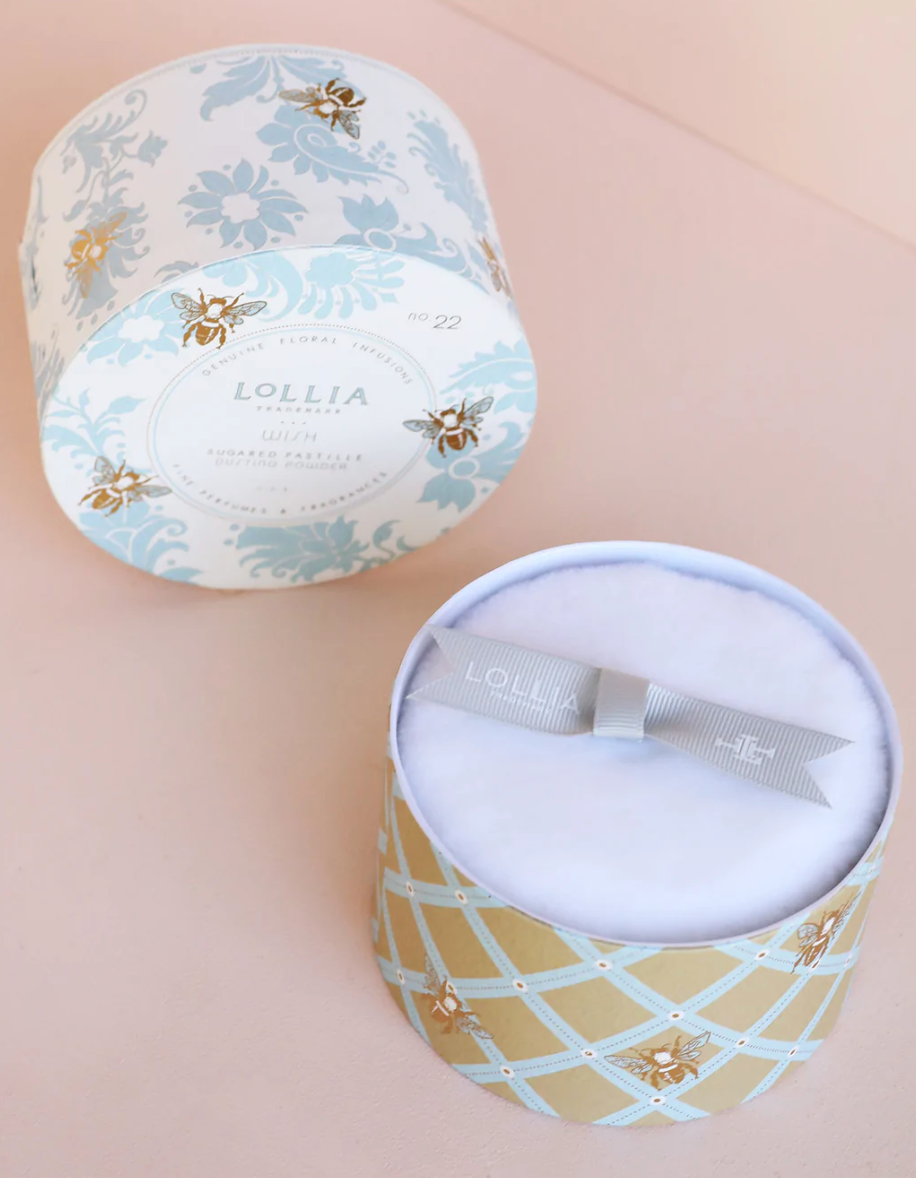 Housed in a box adorned with French-inspired blue foulard and buzzing golden bees. Tucked inside is a luxuriously soft powder puff with a signature Lollia Ribbon Bow handle for an effortless & beautiful dusting of fragrant powder.