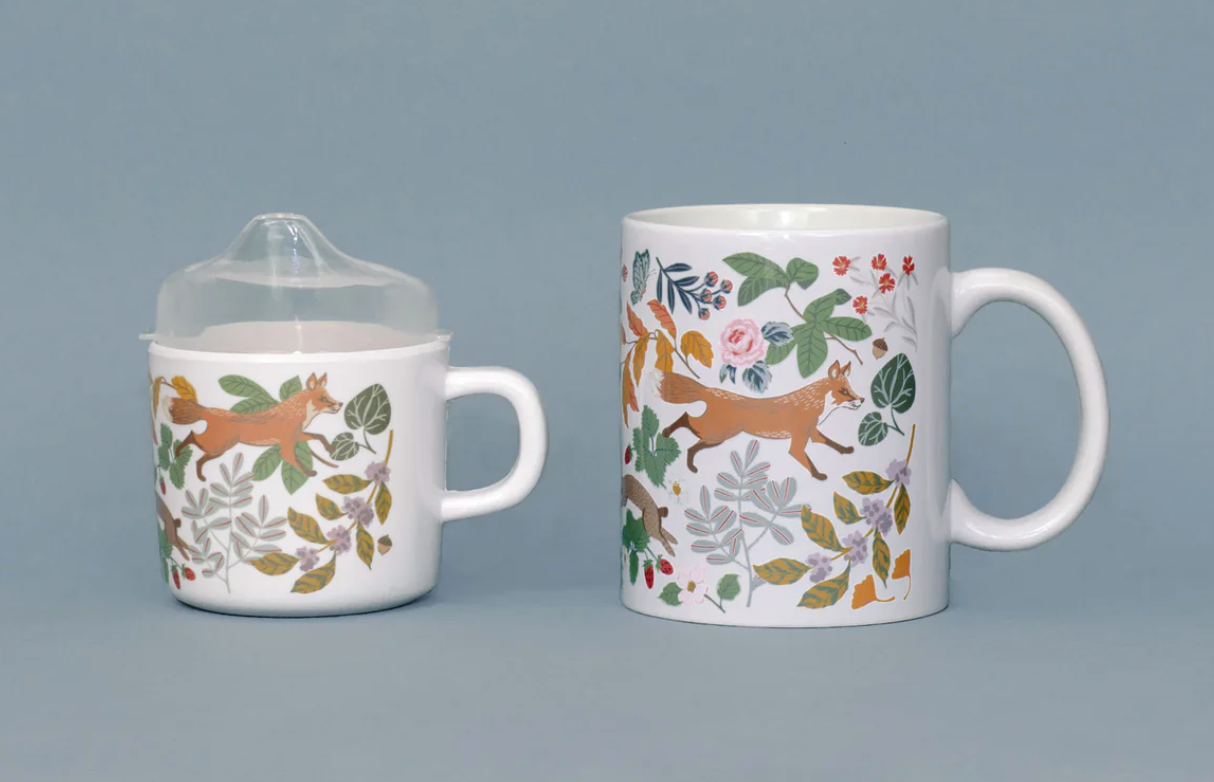 Mama and babe will be sweetly matching with this playful print. Native Georgia plants surround a fox, deer, and a rabbit. Thistles, strawberries, peaches, ginkgo leaves and sweet honey bees are featured. The sippy cup has a removable clear top that can be set aside when it is time to transition to a toddler mug.