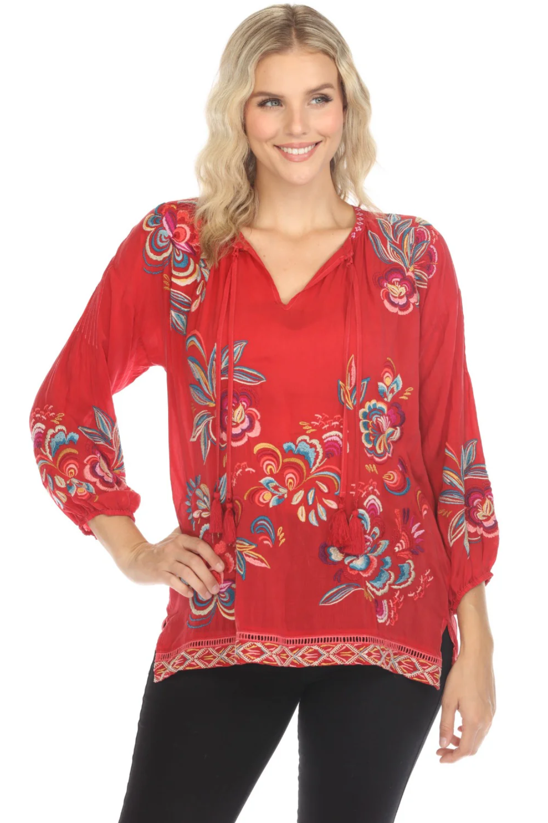 Update your wardrobe with the Zadonia Blouse! This piece features intricate embroidery for a unique touch. Light and airy, it's perfect for any occasion. Say goodbye to boring blouses and hello to a playful addition to your closet.