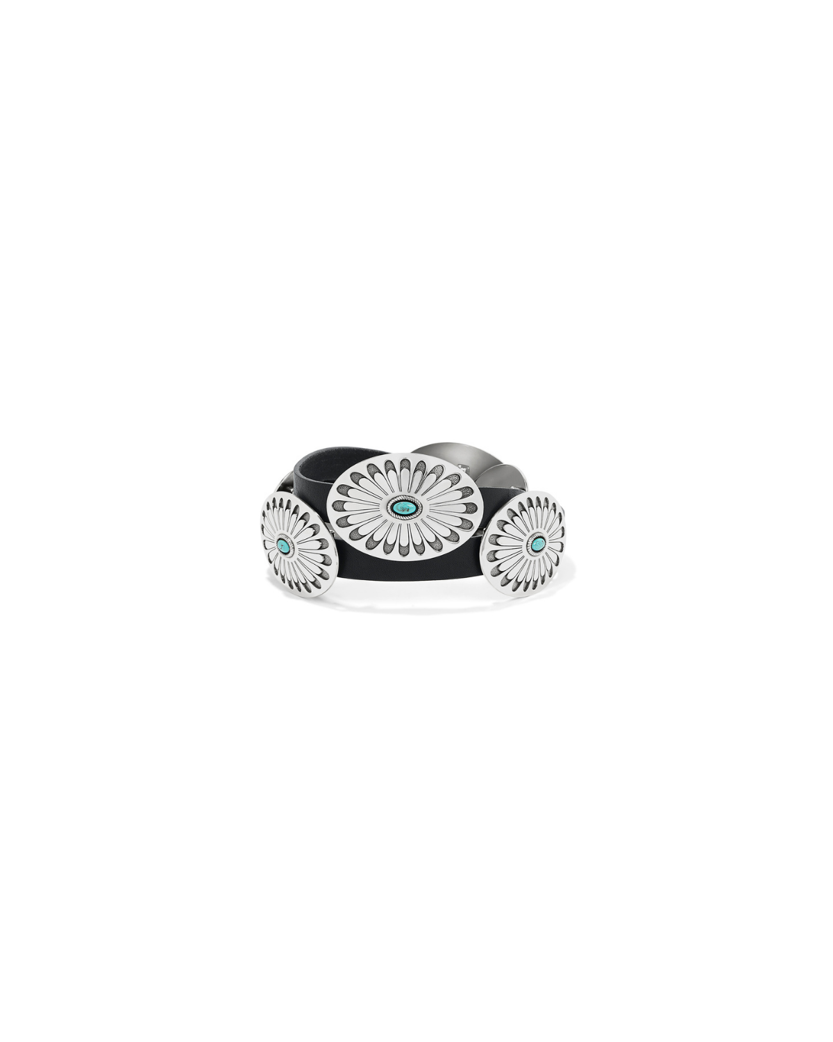 Handcrafted in Los Angeles using the finest materials sourced from around the world, this Latigo leather belt features sliding conchos with engraved filigrees and turquoise accents.