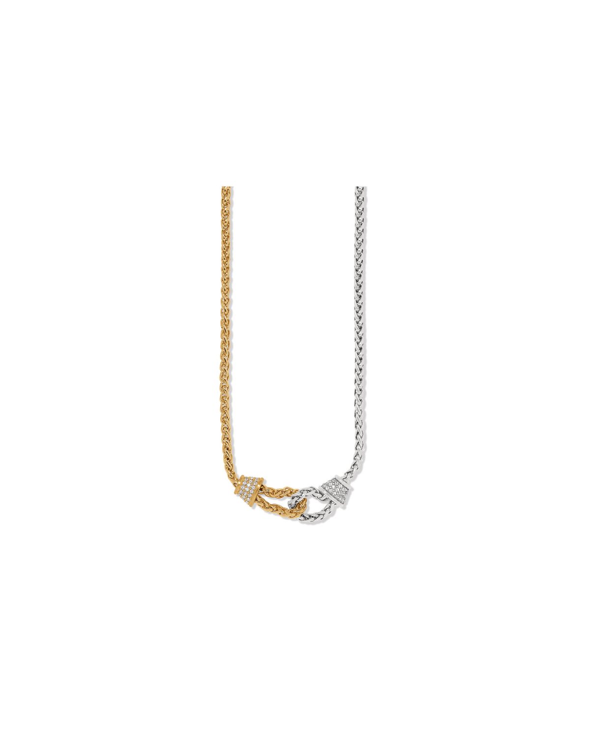 Ventus is the Latin word for wind. Two “winds” come together bringing warmth (gold) and coolness (silver) in this multi-metal short necklace.
