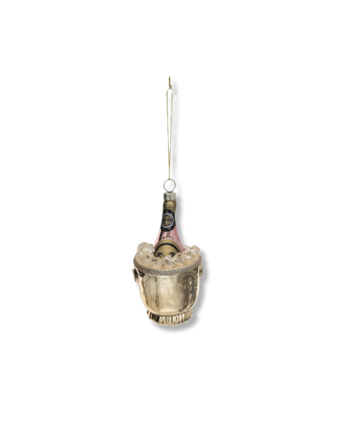 This glass ice bucket with a champagne bottle ornament is a symbol of festivity and luxury. The clear glass ice bucket holds a gold champagne bottle, ready to toast to life's special moments. Measuring 2.25 inches long and 4.25 inches high, it's a sophisticated piece that will catch the eye and elevate the holiday decor. Made of premium glass, this ornament is accentuated with a radiant gold finish, giving it a rich and elegant appearance. Whether it's hung from a tree branch or placed among other table decorations, this ornament brings a celebratory spirit to any setting. Its exquisite craftsmanship and attention to detail make it a must-have for those who appreciate the finer things in life. A luxurious glass ornament featuring a miniature ice bucket with a gold champagne bottle, capturing the essence of celebration. An opulent addition to any holiday decor, this piece is perfect for creating a festive and sophisticated atmosphere. Ideal for display on a mantel or as a centerpiece in a New Year's Eve tablescape, adding a touch of glamour to any occasion.