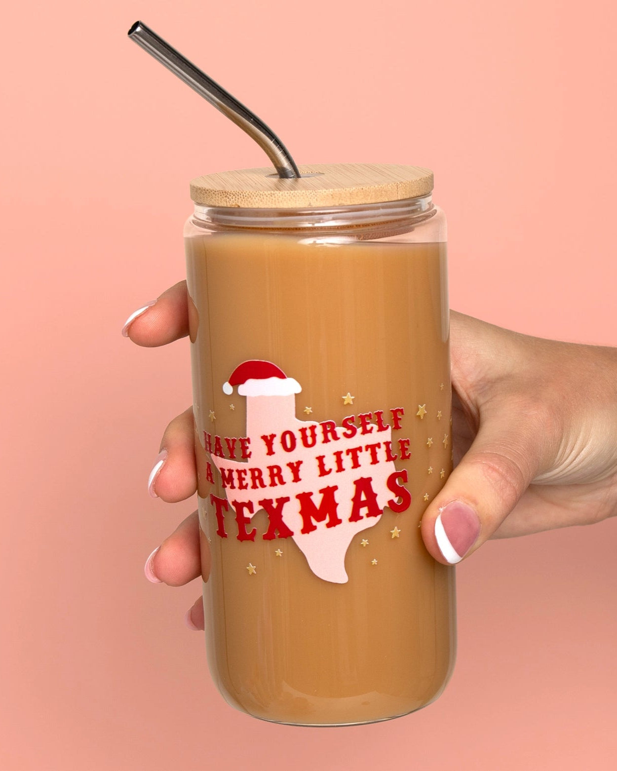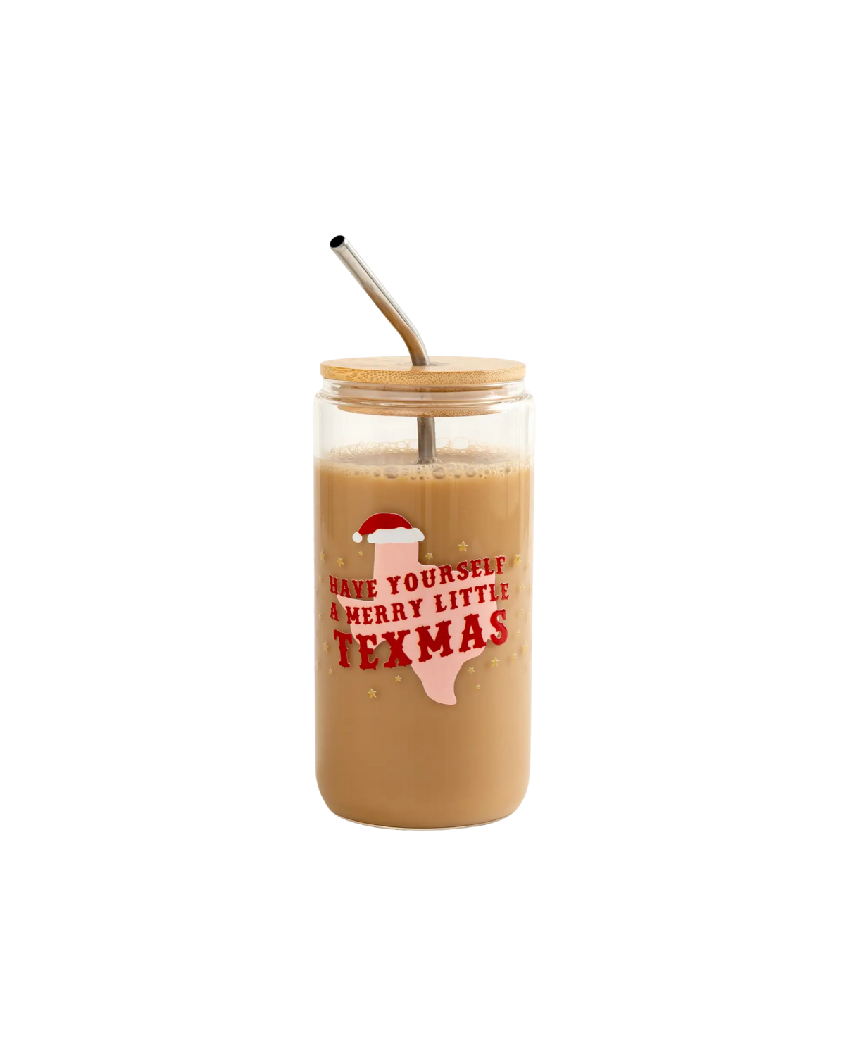 Sip in Lone Star holiday style with the Merry Little Texmas Christmas Western Glass Can! Featuring a Santa hat-topped Texas design and scattered gold stars, this festive glass can brings a little Southern charm to the season. Whether you’re wrapping presents, hosting a holiday party, or sipping iced coffee by the fire, this cup keeps your drink merry and bright. Perfect for gifting to Texas lovers, cowgirls, or anyone who wants a little Western flair in their holiday celebrations! Comes with a bamboo lid and stainless steel straw for easy sipping all season long.