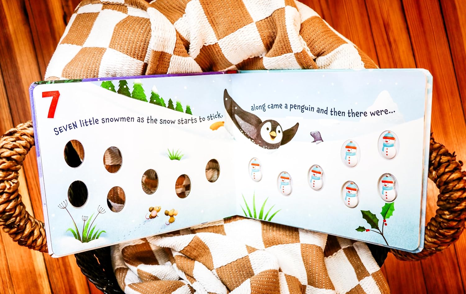 10 little snowmen standing in a line, along came an owl and then there were…nine! Learning to count has never been more fun. This unique board book counts from ten all the way down to one with adorable illustrations. With each page, one more snowman disappears. To help demonstrate this concept, this book uses tactile buttons to help children count how many little snowmen are left as the story progresses. Follow along with the easy rhythm and rhymes of this story and let your child touch the colorful, built-in snowmen toys to give a creative, hands-on approach to counting. Start young ones on a lifetime of loving reading and learning with Ten Little Snowmen.