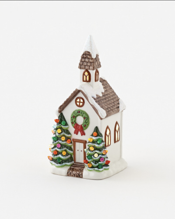 This ceramic holiday decoration depicts a quaint church, festively decorated for the season. The white-walled church has a brown, shingled roof dusted with snow, and a steeple that's also covered in a layer of white. Two green pine trees, adorned with colorful lights, stand on either side of the front door. A classic green wreath with a red bow hangs on the front of the church.