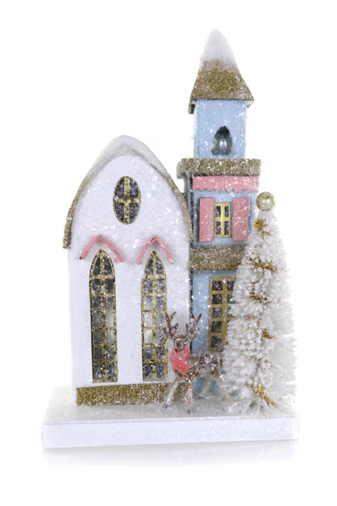 Bring festive charm to any space with the Petite Christmas Church decor. This pastel-colored church is dusted with snow and glitter, featuring a friendly reindeer and a Christmas tree in front. Perfect for adding a playful and whimsical touch to your holiday displays!