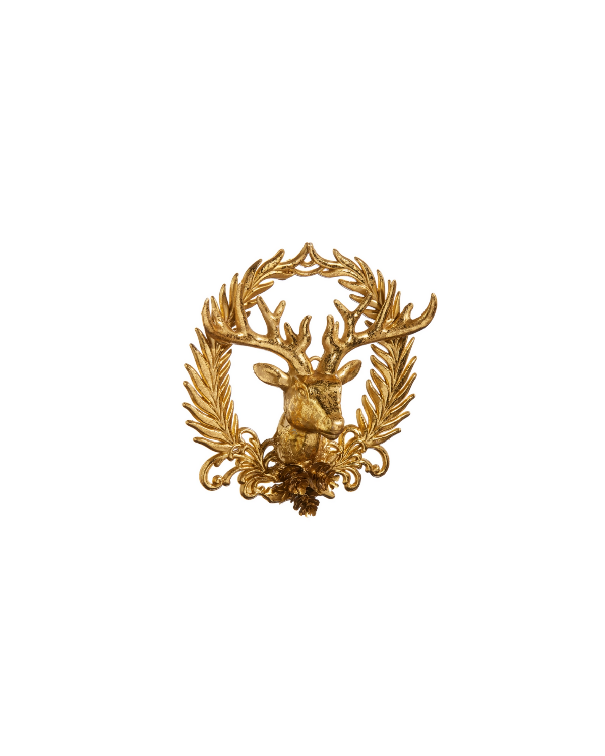 Add a dash of holiday sparkle with this playful gold Deer with Wreath Emblem Ornament. Made of durable plastic, it’s perfect for brightening up your tree or festive displays with a cheerful and charming touch.