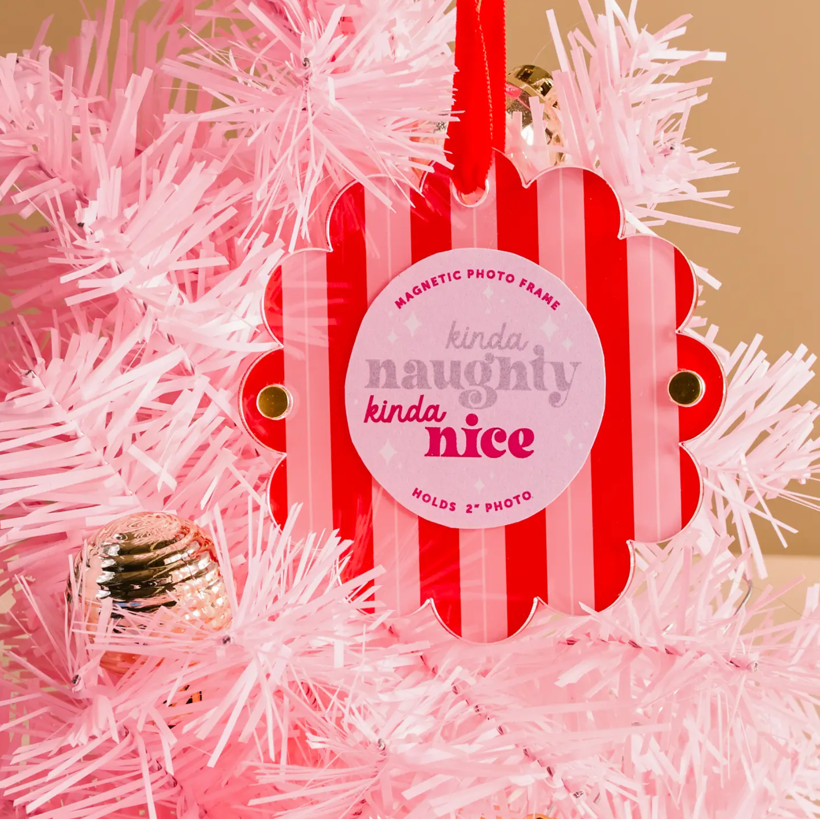- Modern, sleek design with charming scalloped edge includes a ribbon to display on your tree or to adorn a gift magnetic panels make swapping out your favorite mini photos a breeze