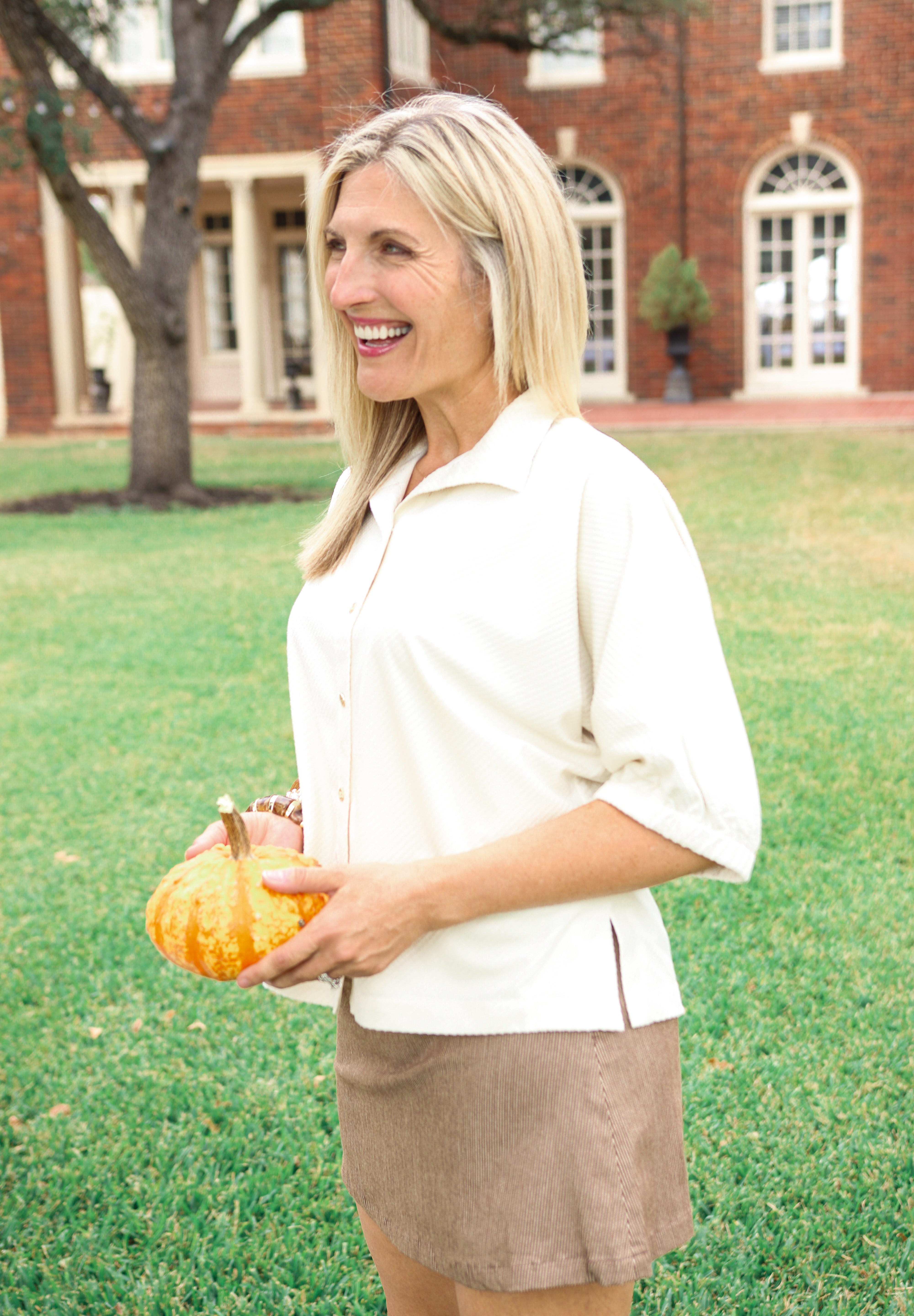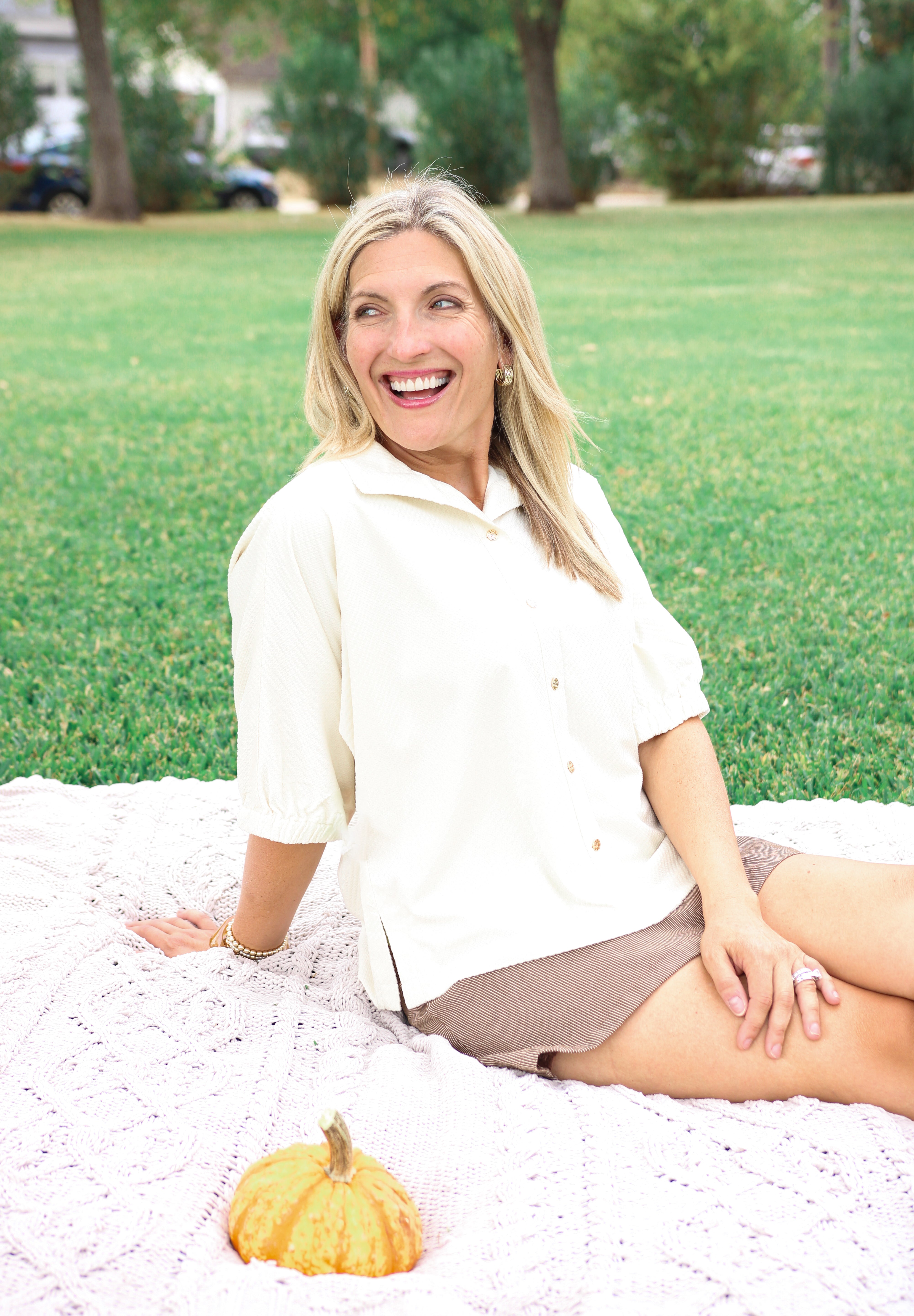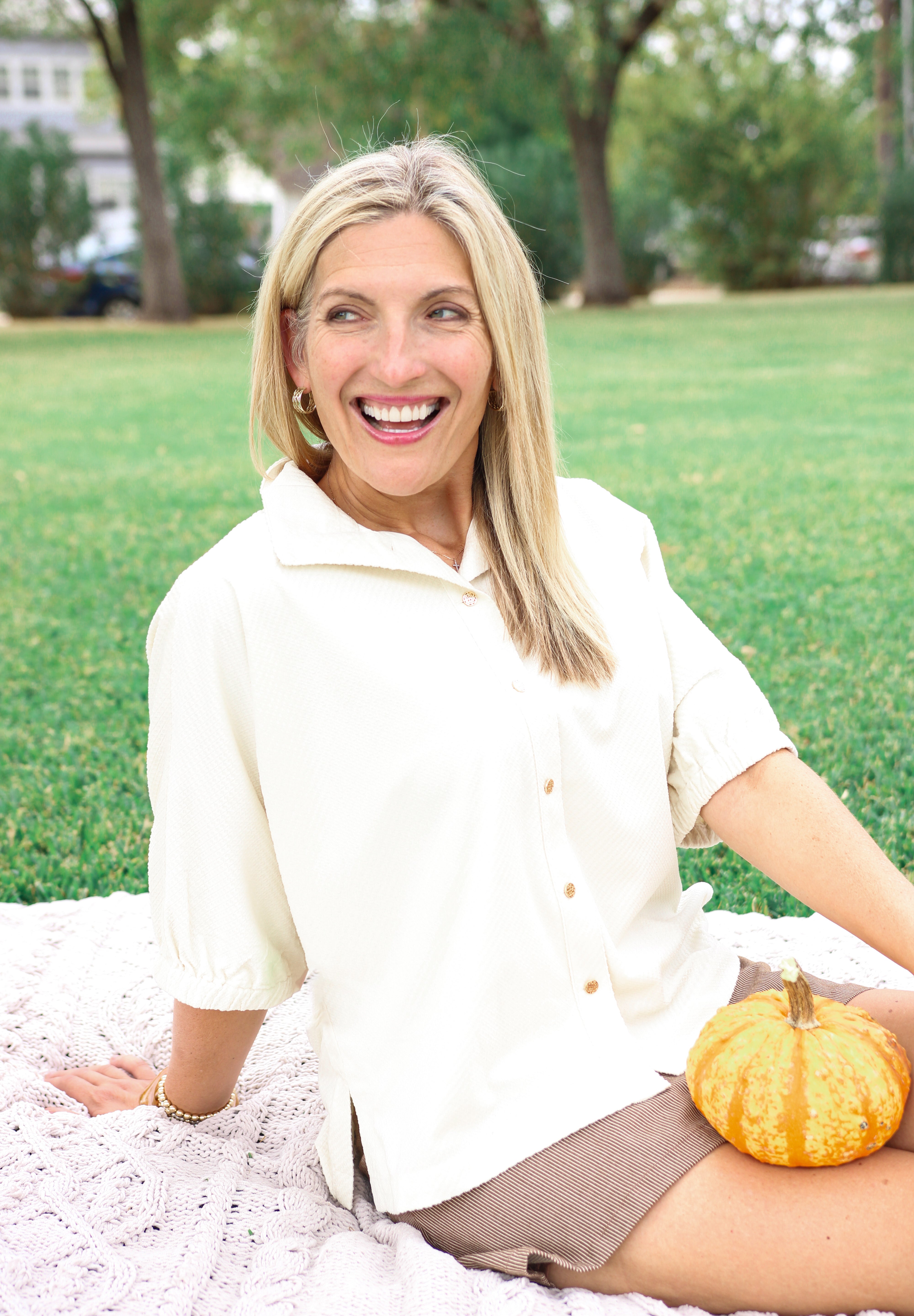 The Bonny Top offers a fresh take on the classic Poppy silhouette, reimagined in a textured velvet for added depth and dimension. Designed with a structured stand collar, relaxed elastic dolman sleeves, and a front placket finished with signature gold buttons, this style balances ease with polish. The loose-fitting silhouette allows for comfortable wear while maintaining a refined look.