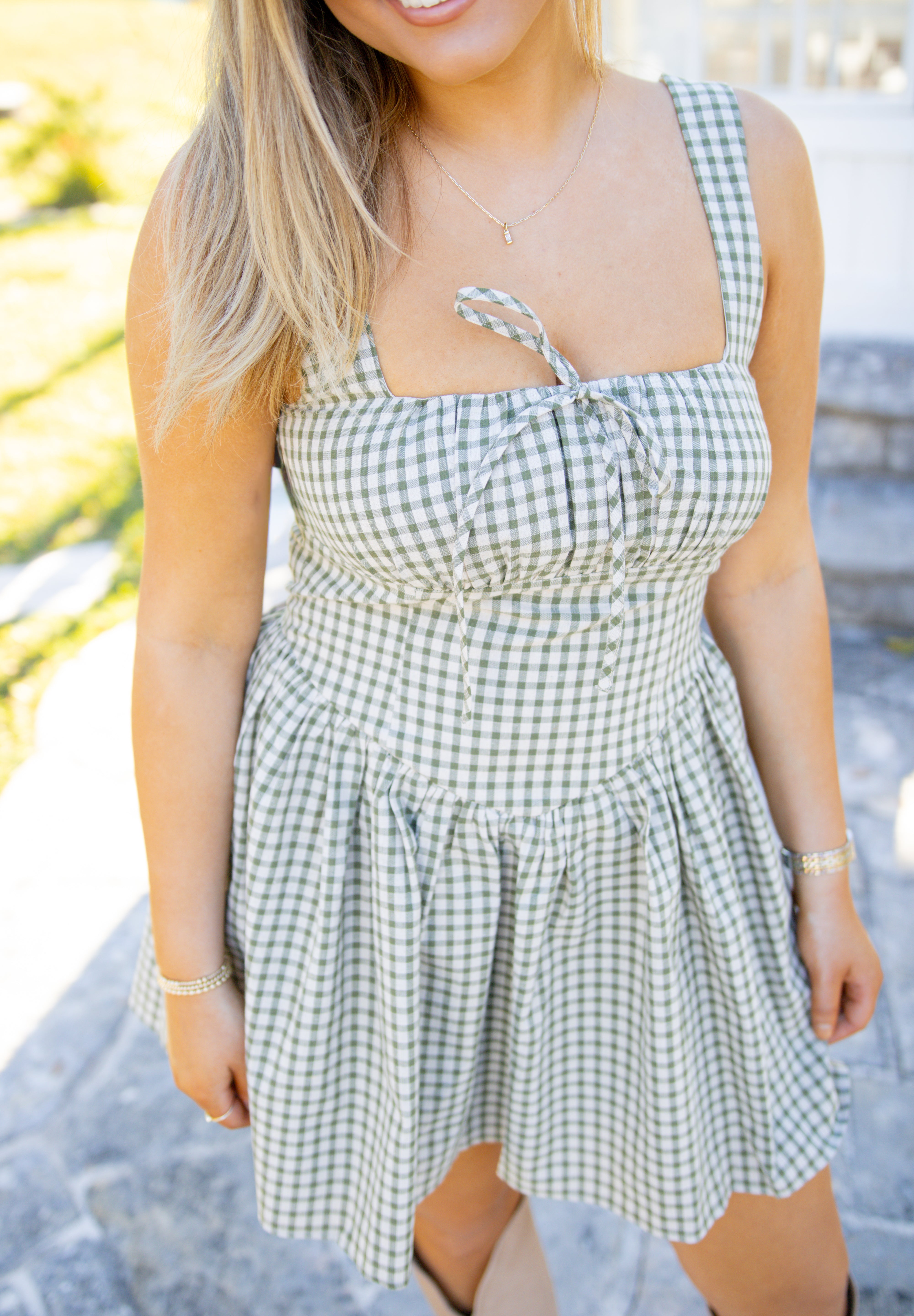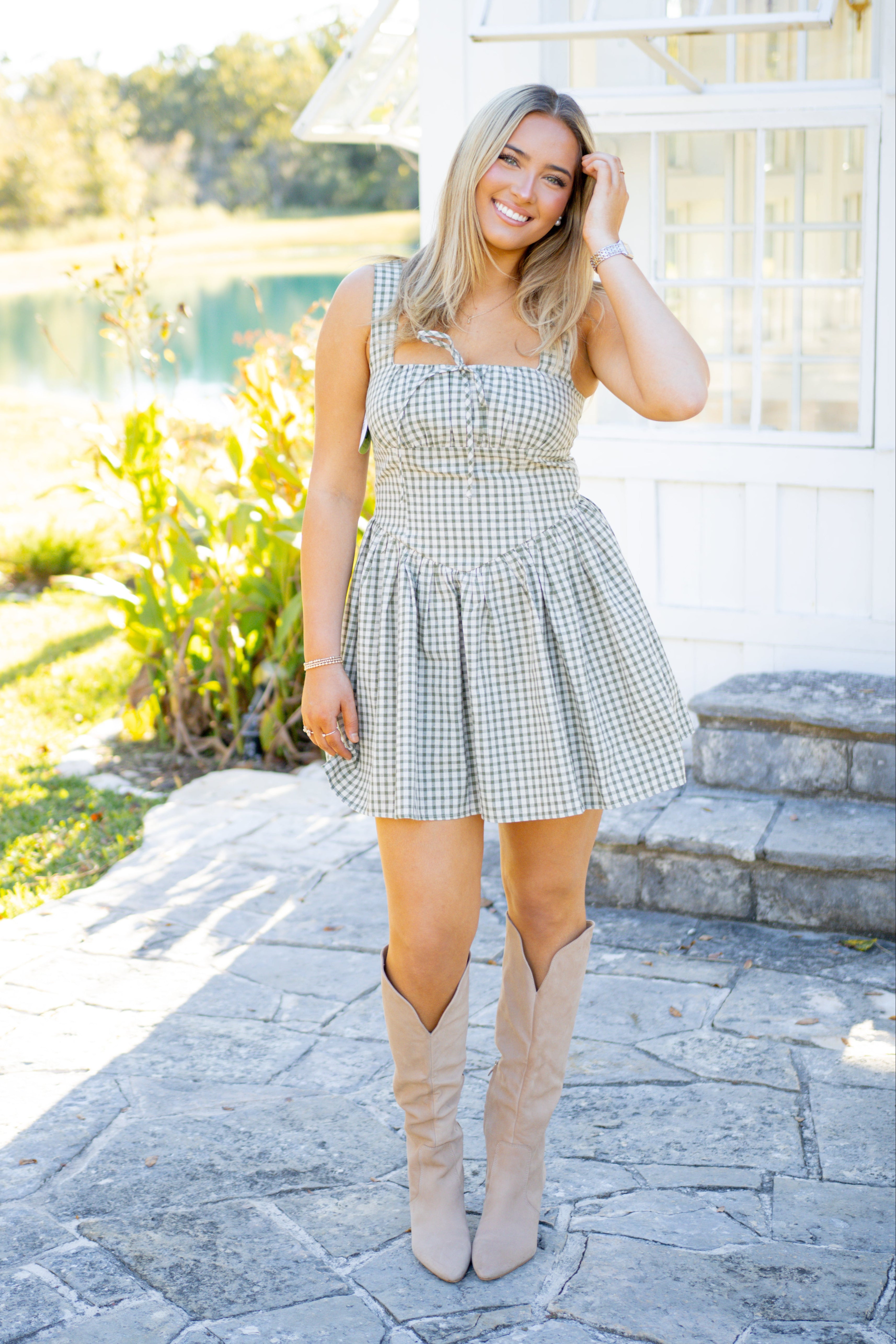 Channel your inner retro icon in the Checkmate Mini Dress, where vintage vibes meet modern comfort. This sleeveless stunner showcases a crisp gingham pattern in olive green, complete with a flattering square neckline and smocked back panel for that perfect fit. Crafted from a breathable cotton-polyester blend with a silky rayon lining, it's as comfortable as it is chic. Whether you're dressing it up for a night out or keeping it casual, this versatile piece transitions seamlessly from fall festivities to winter gatherings. Machine washable for easy care—because looking good shouldn't be complicated.