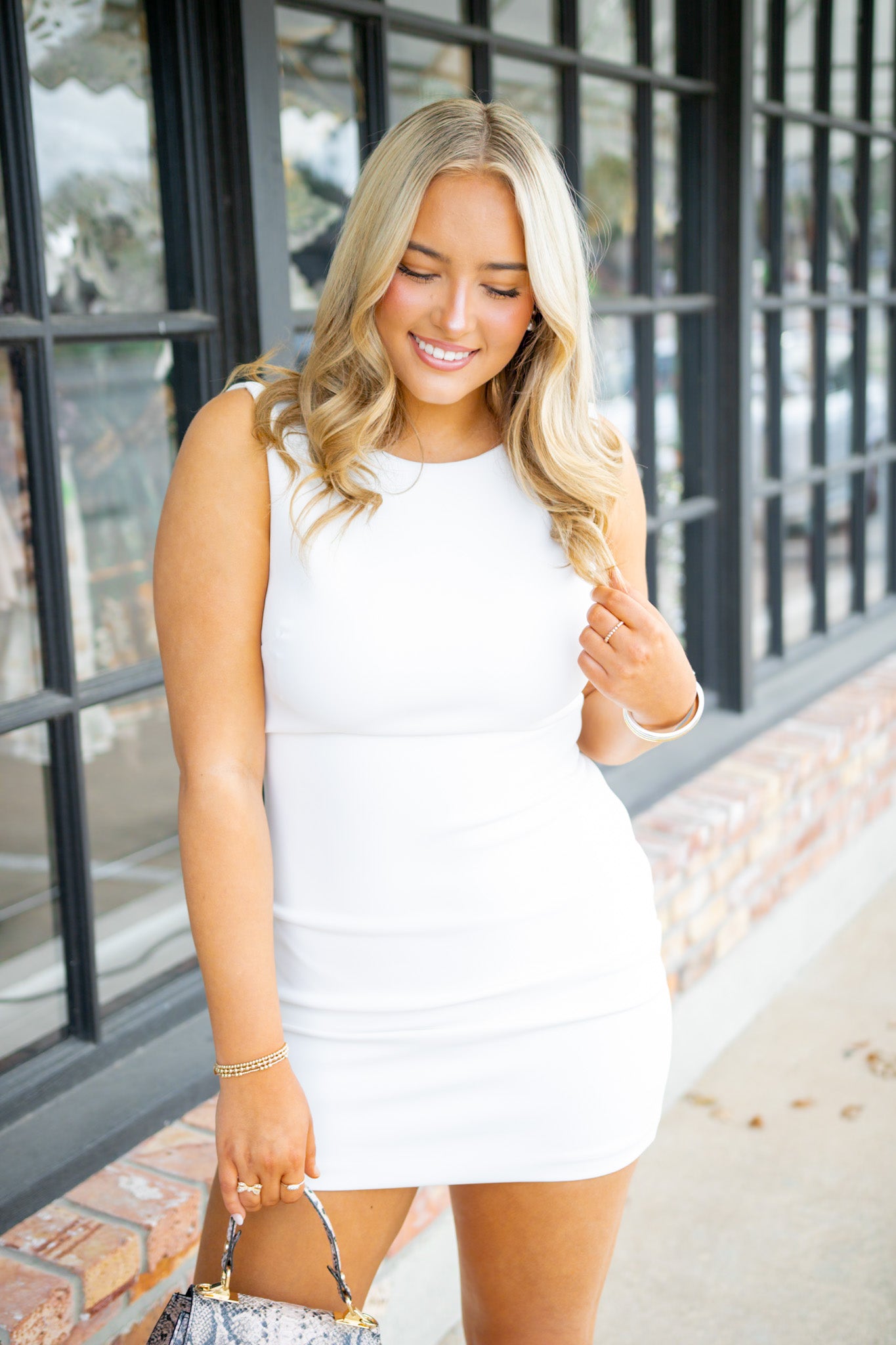 Turn heads in this chic mini dress featuring a daring back cutout and twisted detail that adds just the right amount of edge. The off-white hue keeps things fresh and versatile, while the playful silhouette makes it perfect for nights out or special occasions. Whether you're hitting the dance floor or making an entrance, this dress delivers style with a confident twist. Pair it with your favorite heels and minimal jewelry to let the back design steal the show.