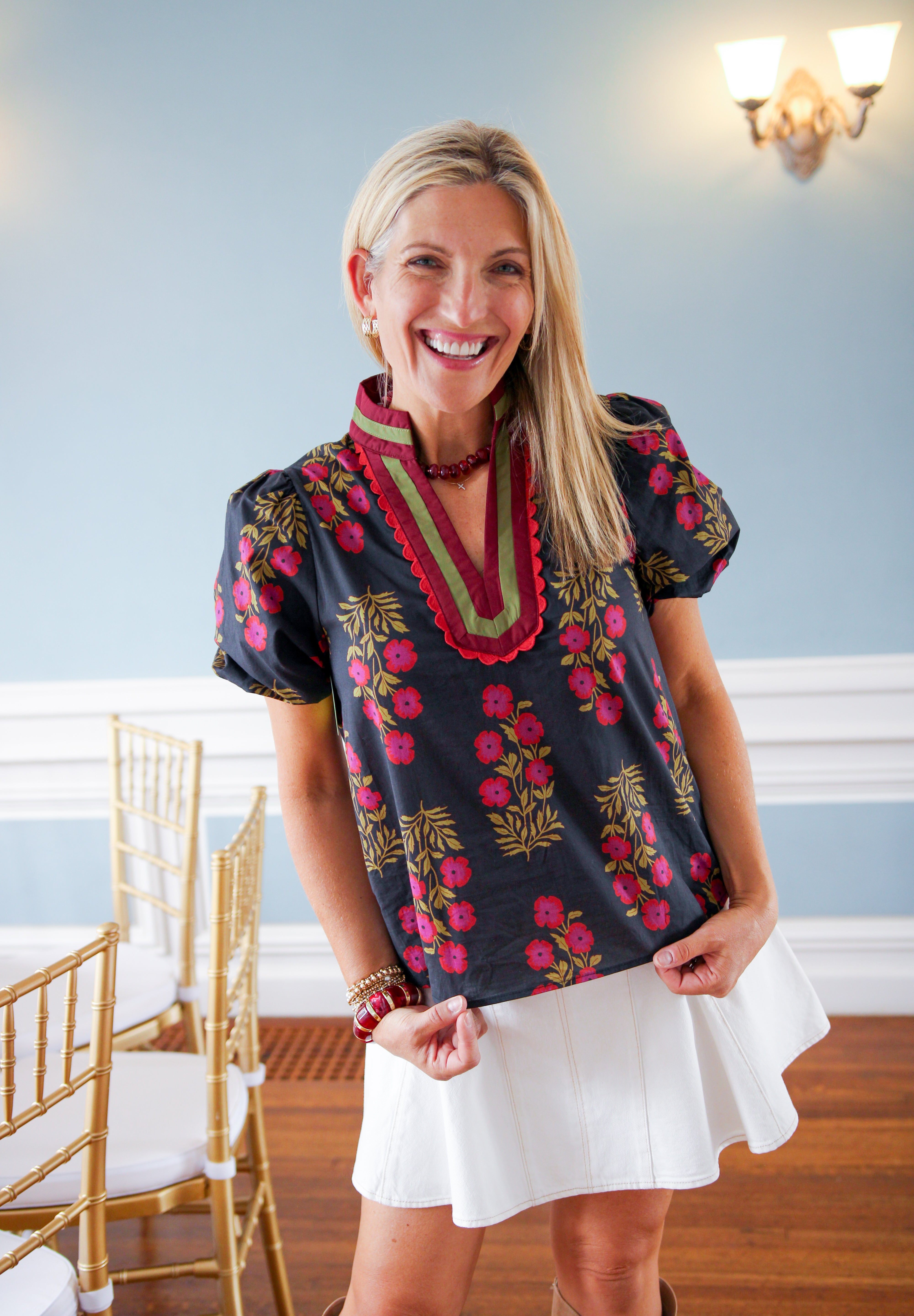 This charming floral print top features playful short bubble sleeves and a vibrant multicolor accent V-neck with a band collar. Crafted from lightweight woven fabric, it offers a comfortable fit without being sheer or lined—perfect for effortless, breezy style on sunny days.