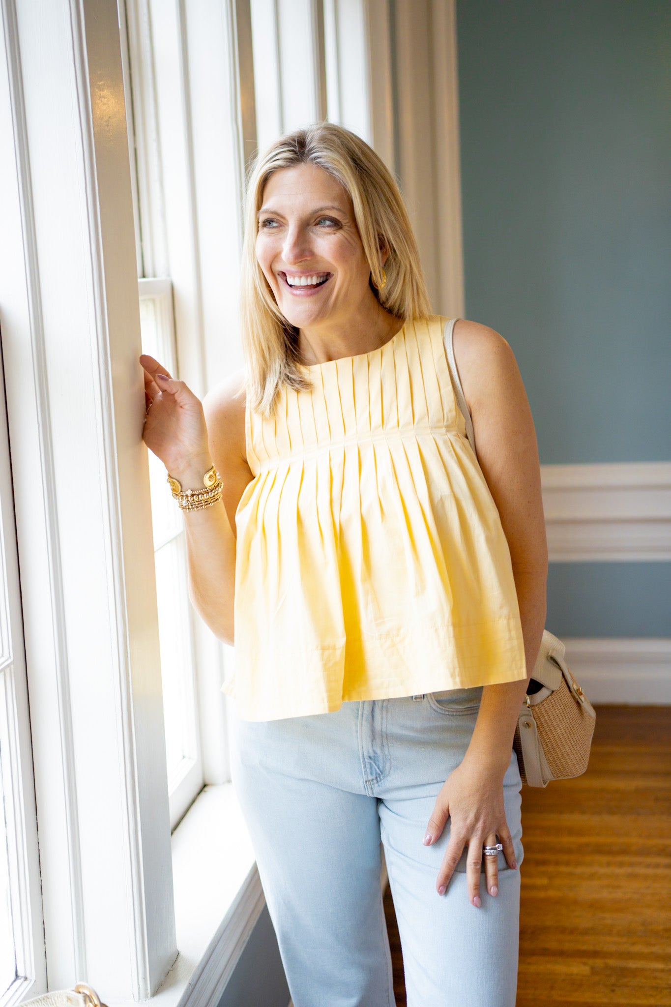 Sleek, playful, and oh-so-versatile—this pale yellow sleeveless top is about to become your favorite layering piece. The high-low cut adds movement and dimension, while subtle pleats give it just enough personality to stand out. A concealed back zipper means zero fuss and all finesse. Whether you're dressing it up for an event or keeping it casual with your everyday basics, this top delivers effortless style that works harder than it looks.