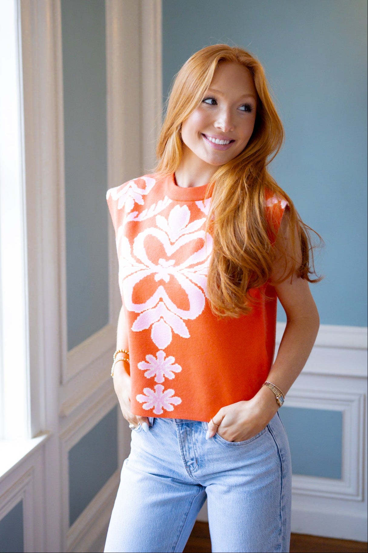 Make a statement with this vibrant orange sleeveless knit top, featuring an eye-catching pink accent design on the front. Perfect for layering over your favorite tee or wearing solo on warmer days, this playful piece brings instant color and personality to any outfit. The lightweight knit fabric keeps you comfortable while the bold color combo ensures you'll stand out from the crowd. A fun, versatile essential for anyone who loves to express their style with confidence.